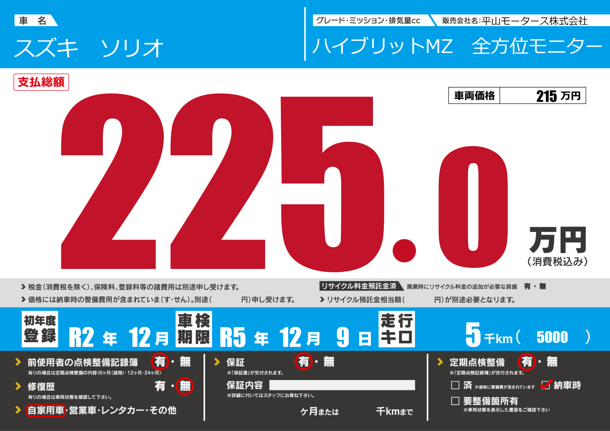 | 走行キロ | 0.5万km | 初年度登録 | R2年12月 |