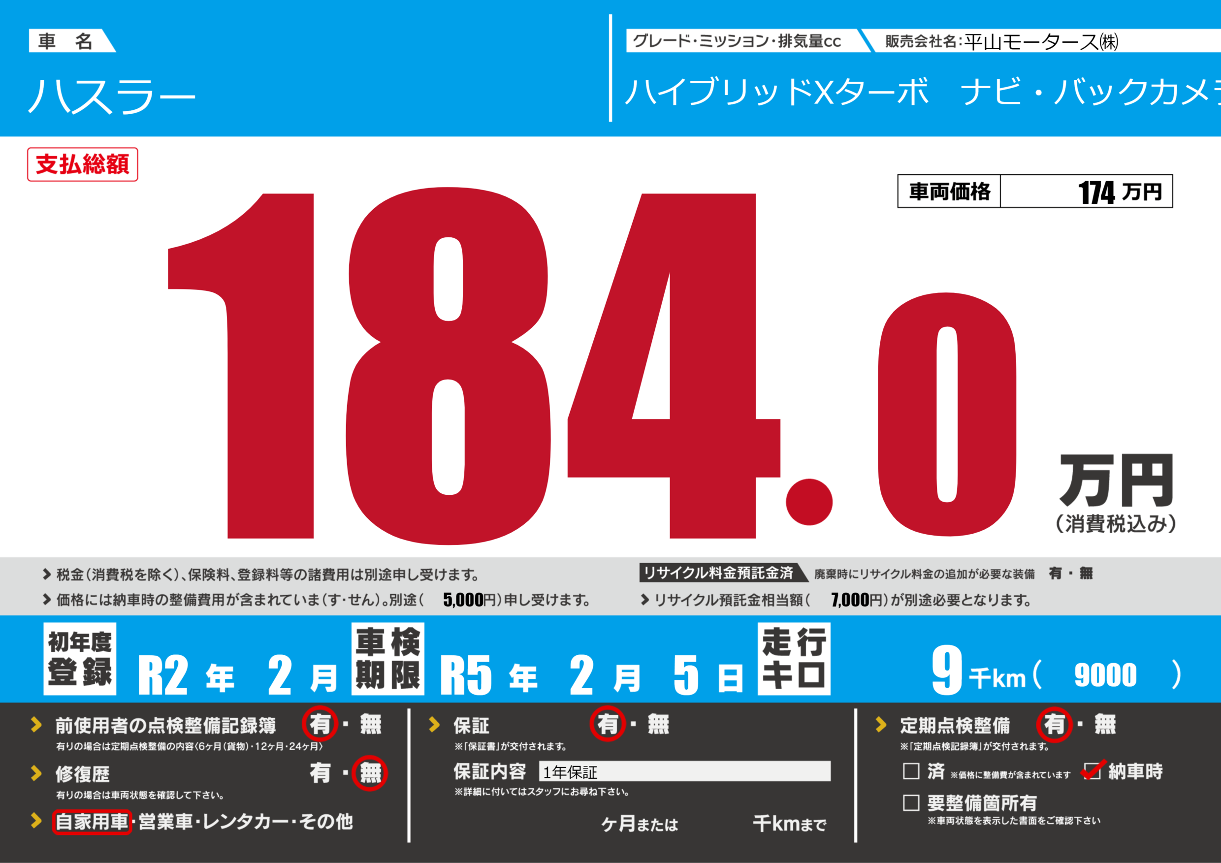 | 走行キロ | 0.9万km | 初年度登録 | R2年2月 |
