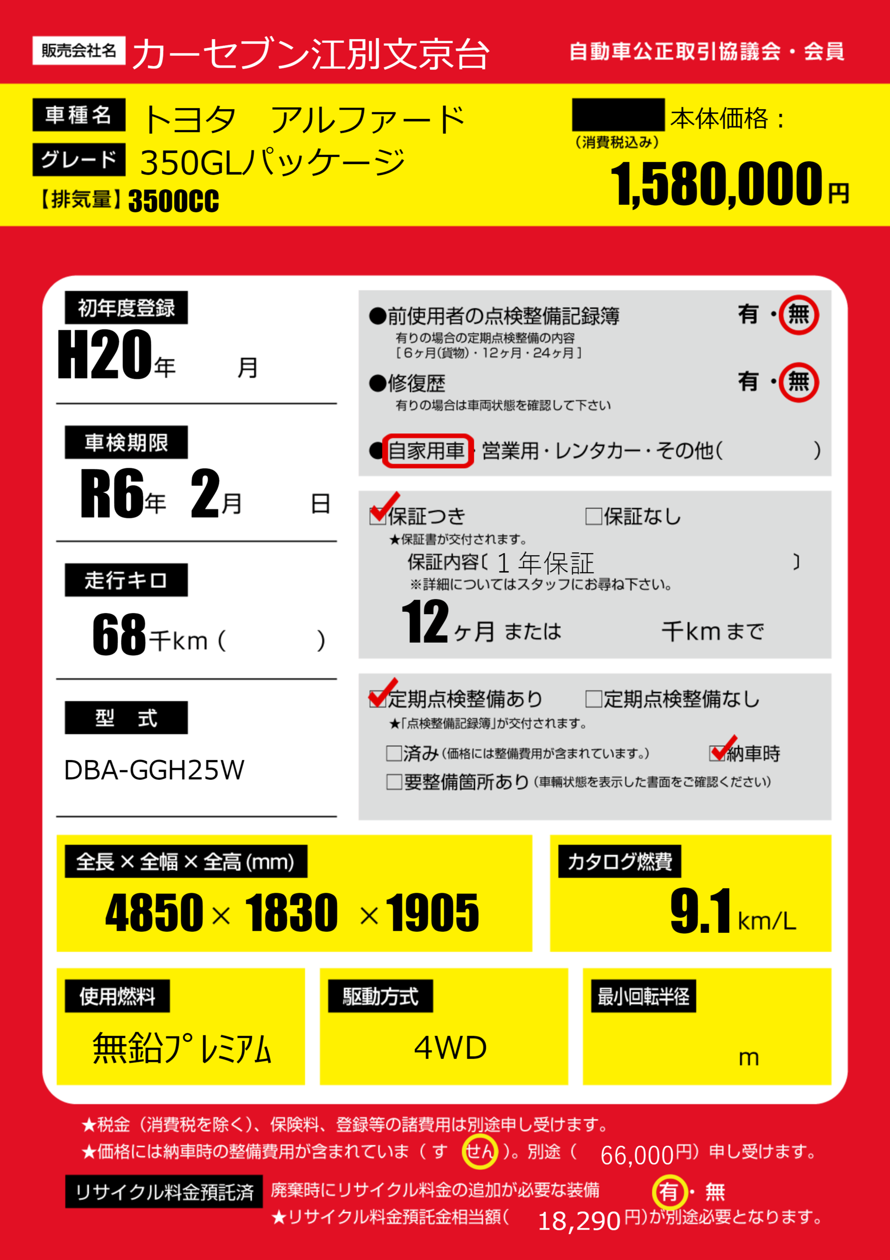 | 車名 | トヨタ アルファード | グレード ミッション 排気量 |