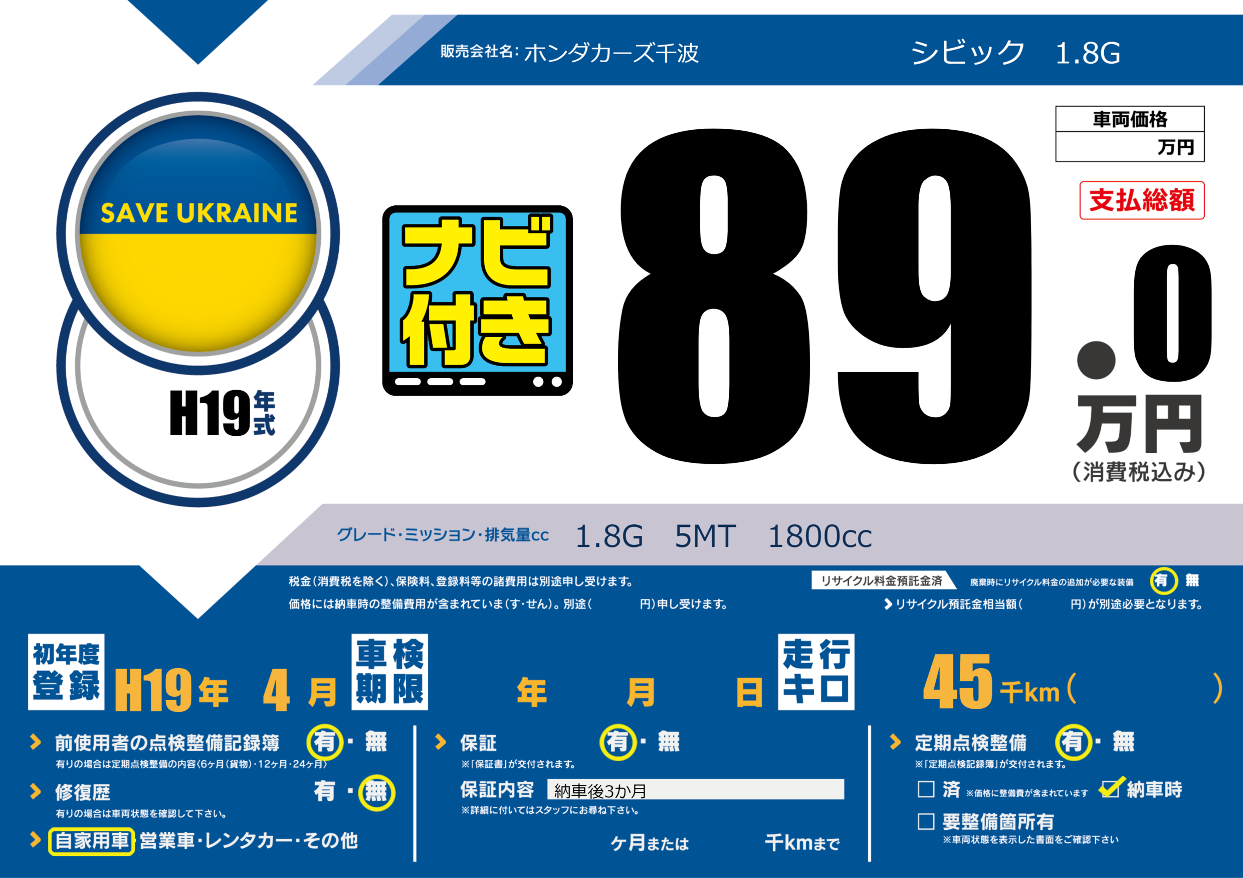 | 車名 | シビック 1.8G | グレード ミッション 排気量 |