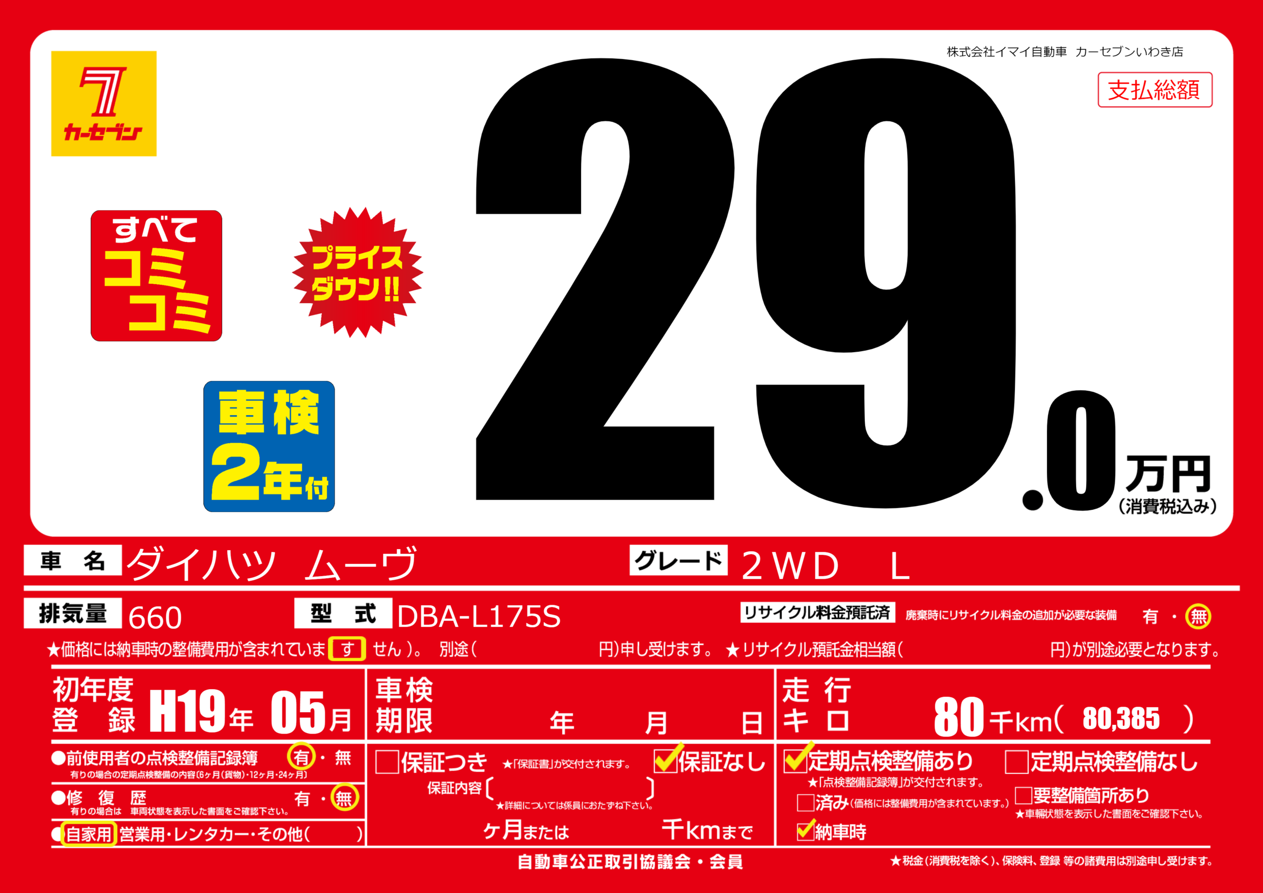 | 走行キロ | 8万km | 初年度登録 | H19年05月 |