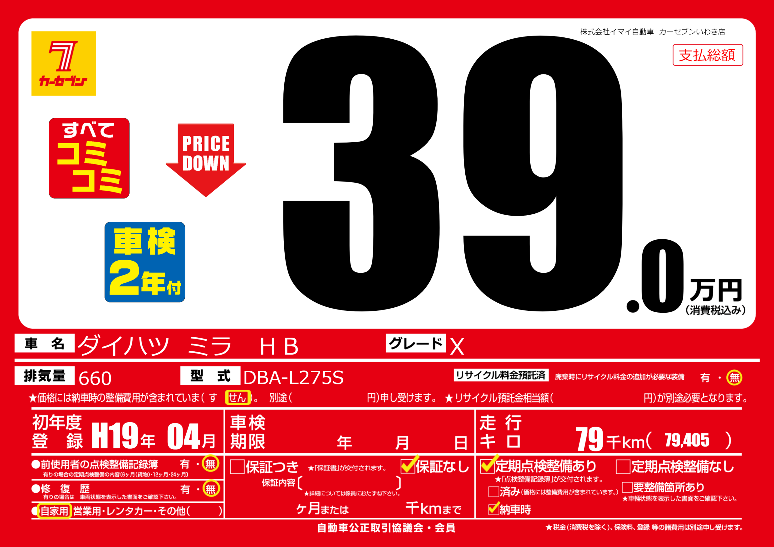 | 車名 | ダイハツ ミラ HB | グレード ミッション 排気量 |