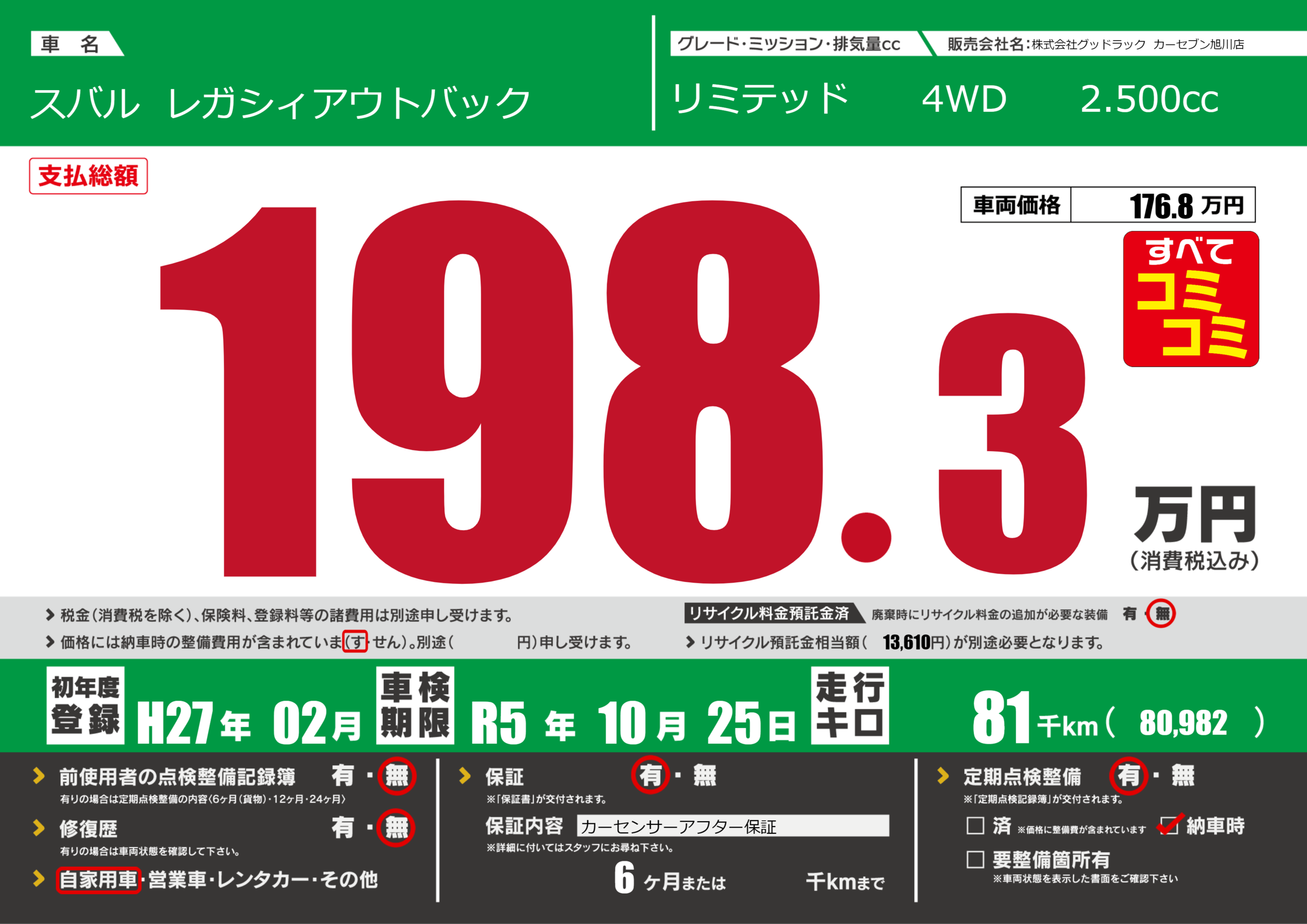 | 車名 | スバル レガシィアウトバック | グレード ミッション 排気量 |