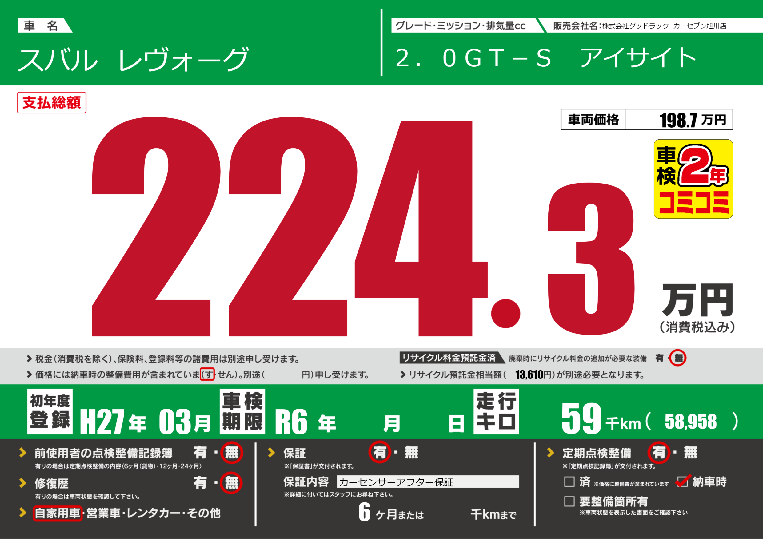 | 車名 | スバル レヴォーグ | グレード ミッション 排気量 |