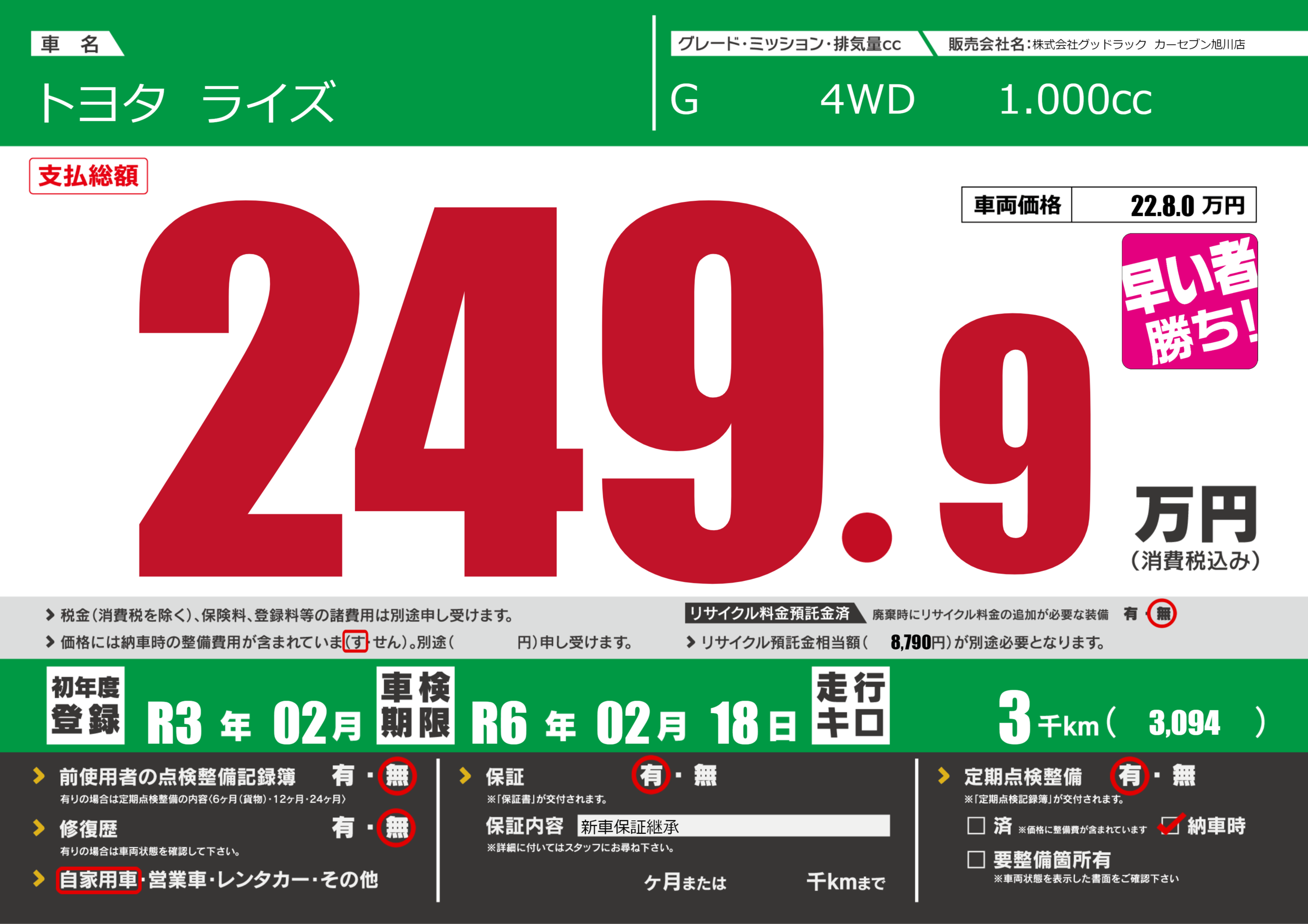 | 走行キロ | 0.3万km | 初年度登録 | R3年02月 |
