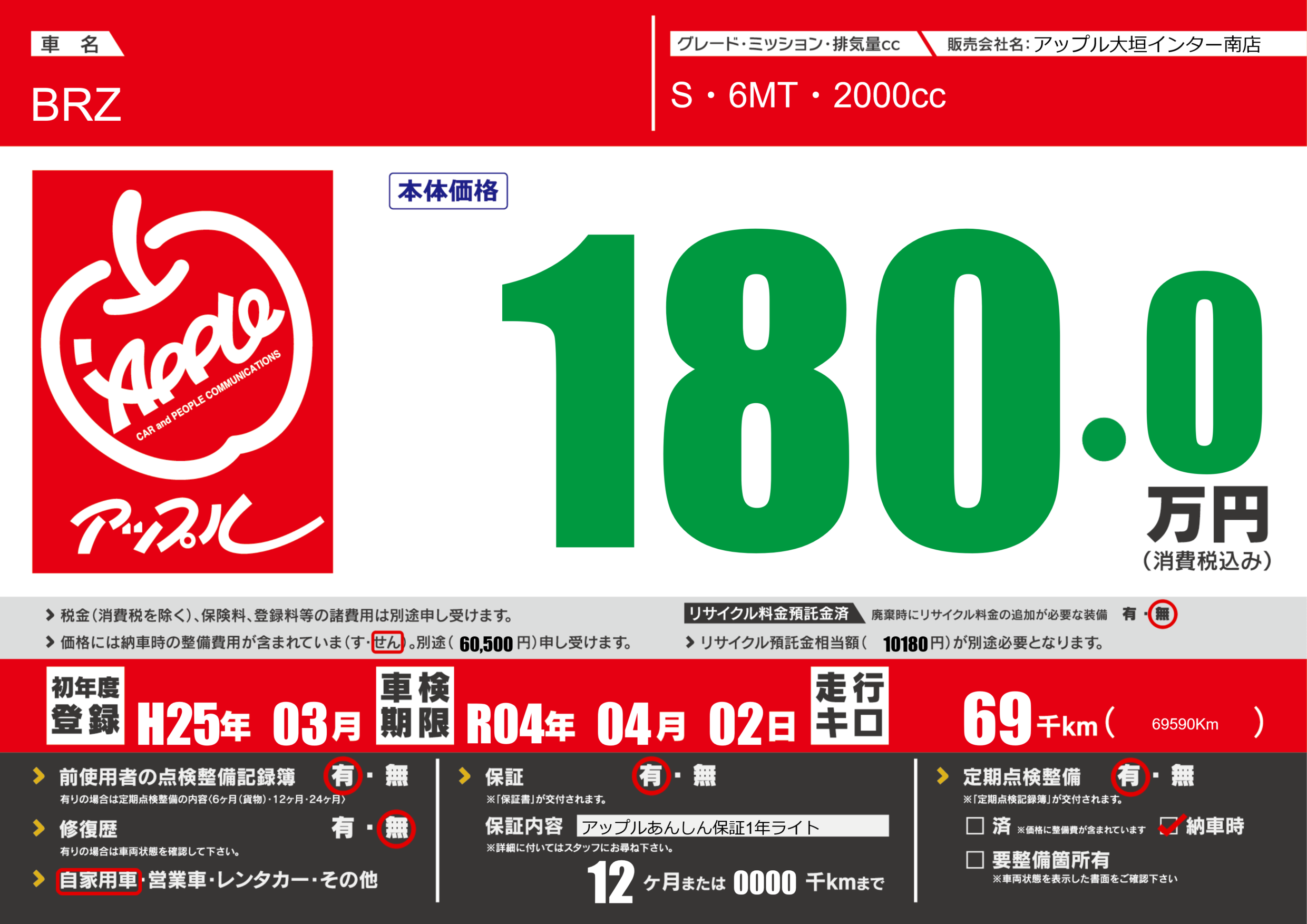 | 車名 | BRZ | グレード ミッション 排気量 |
