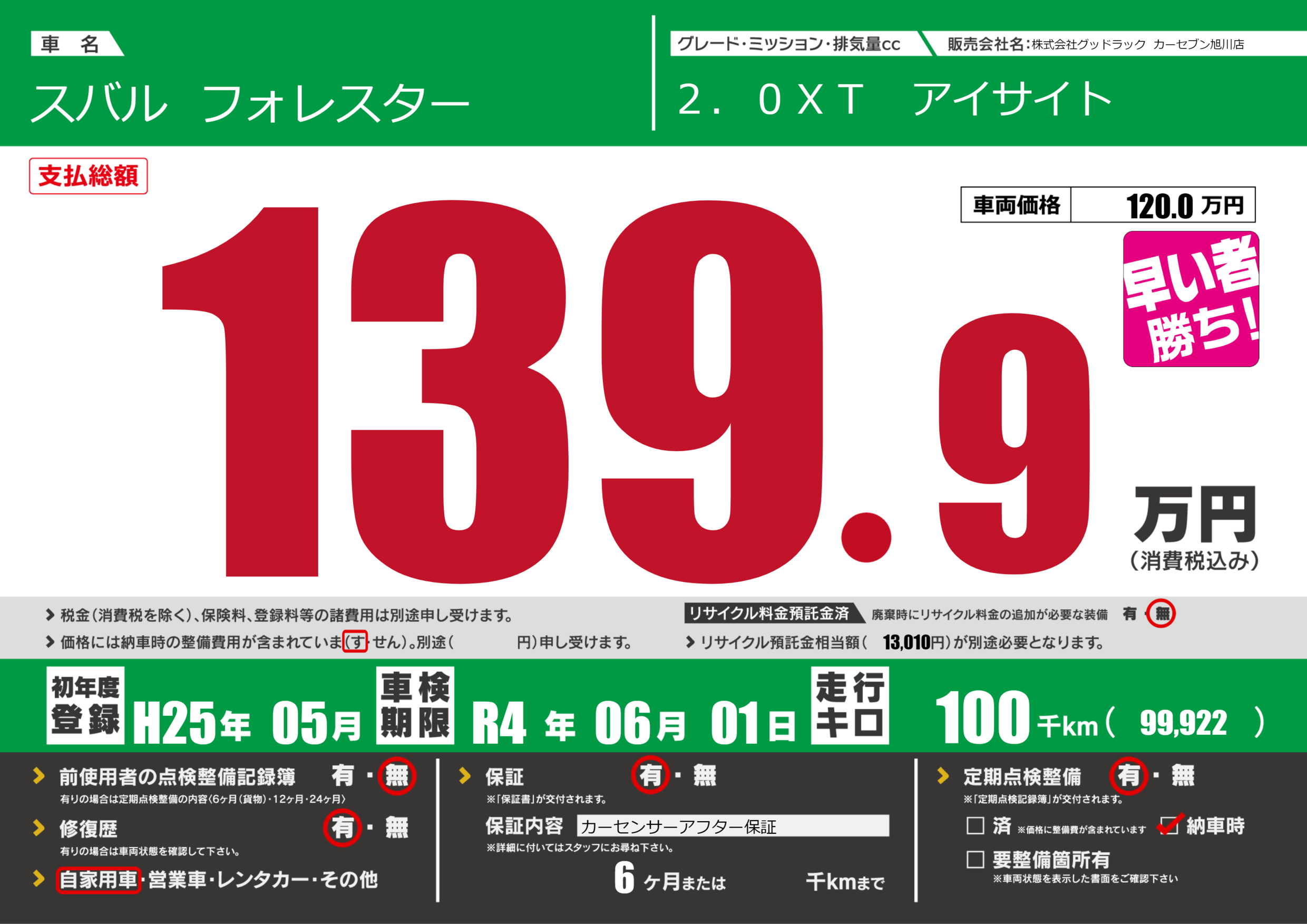 | 車名 | スバル フォレスター | グレード ミッション 排気量 |