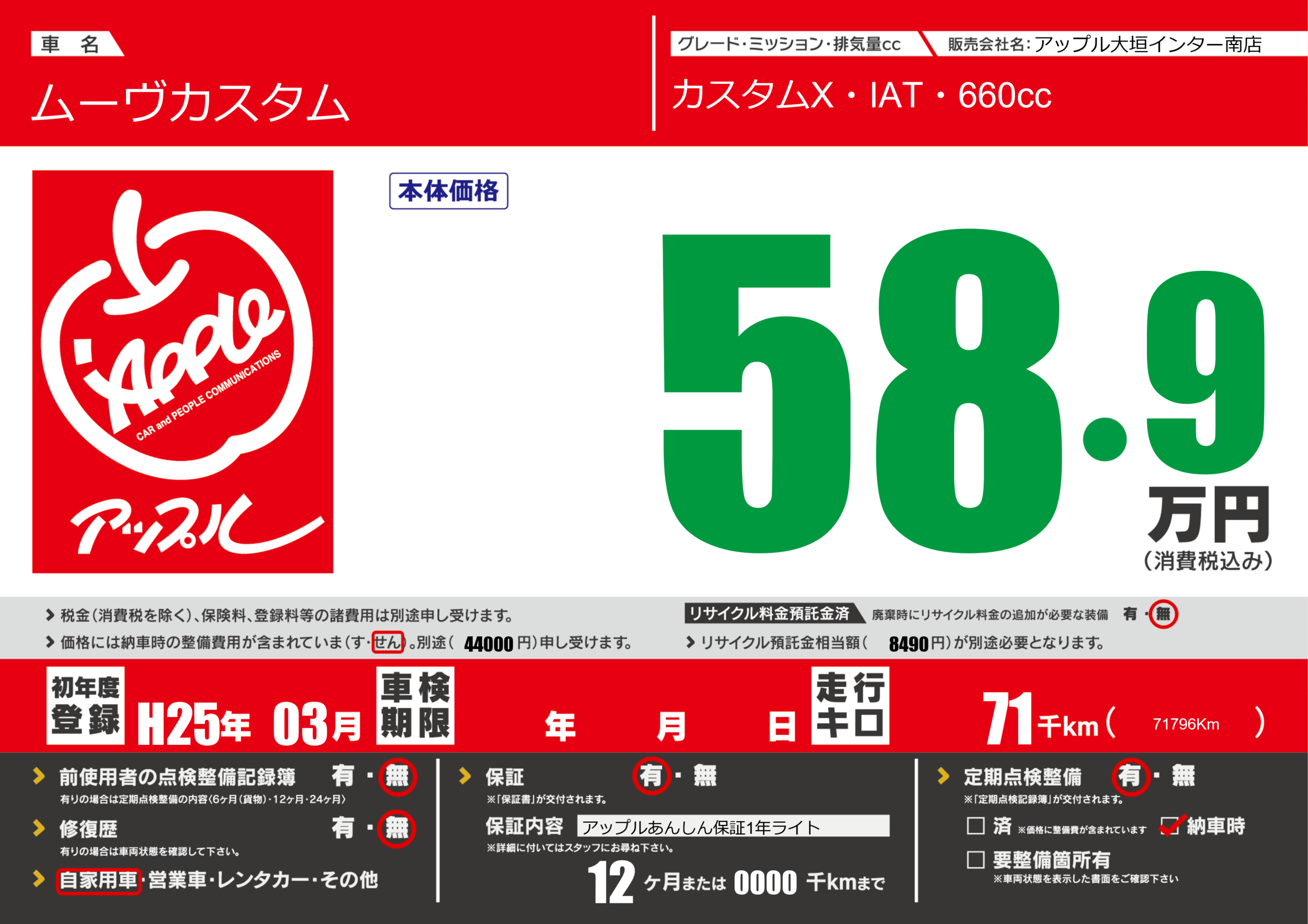 | 車名 | ムーヴカスタム | グレード ミッション 排気量 |