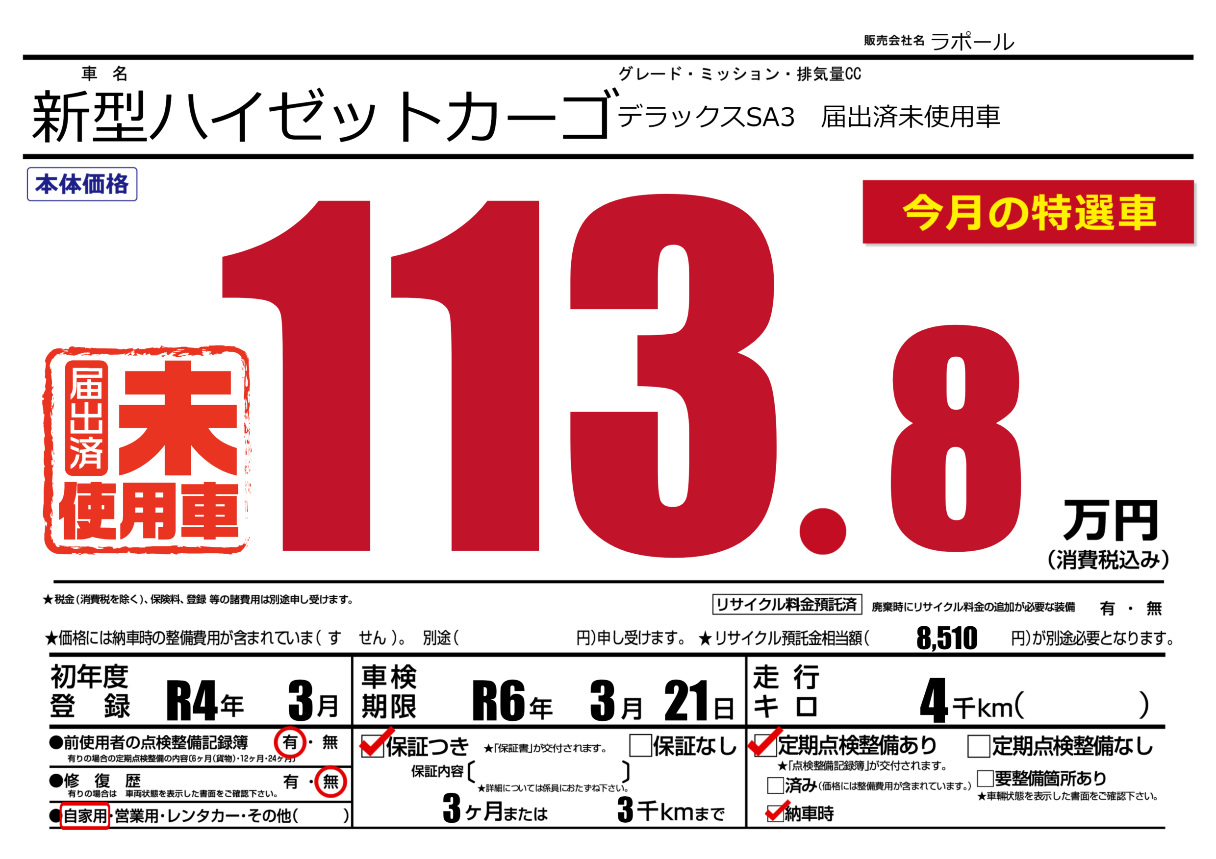 保証付き 保証内容(---) 3ヶ月または(3)千kmまで |