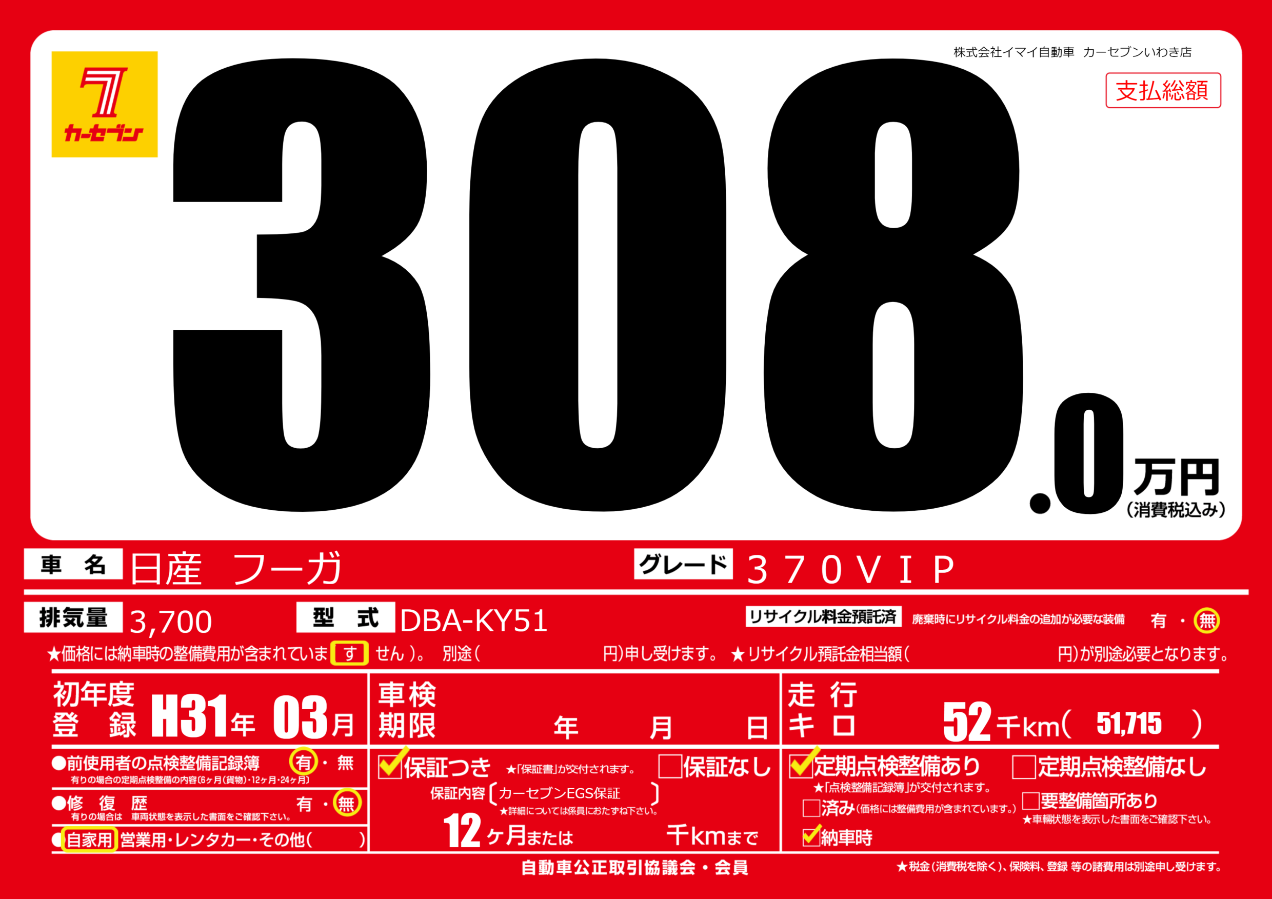 | 車名 | 日産 フーガ | グレード ミッション 排気量 |