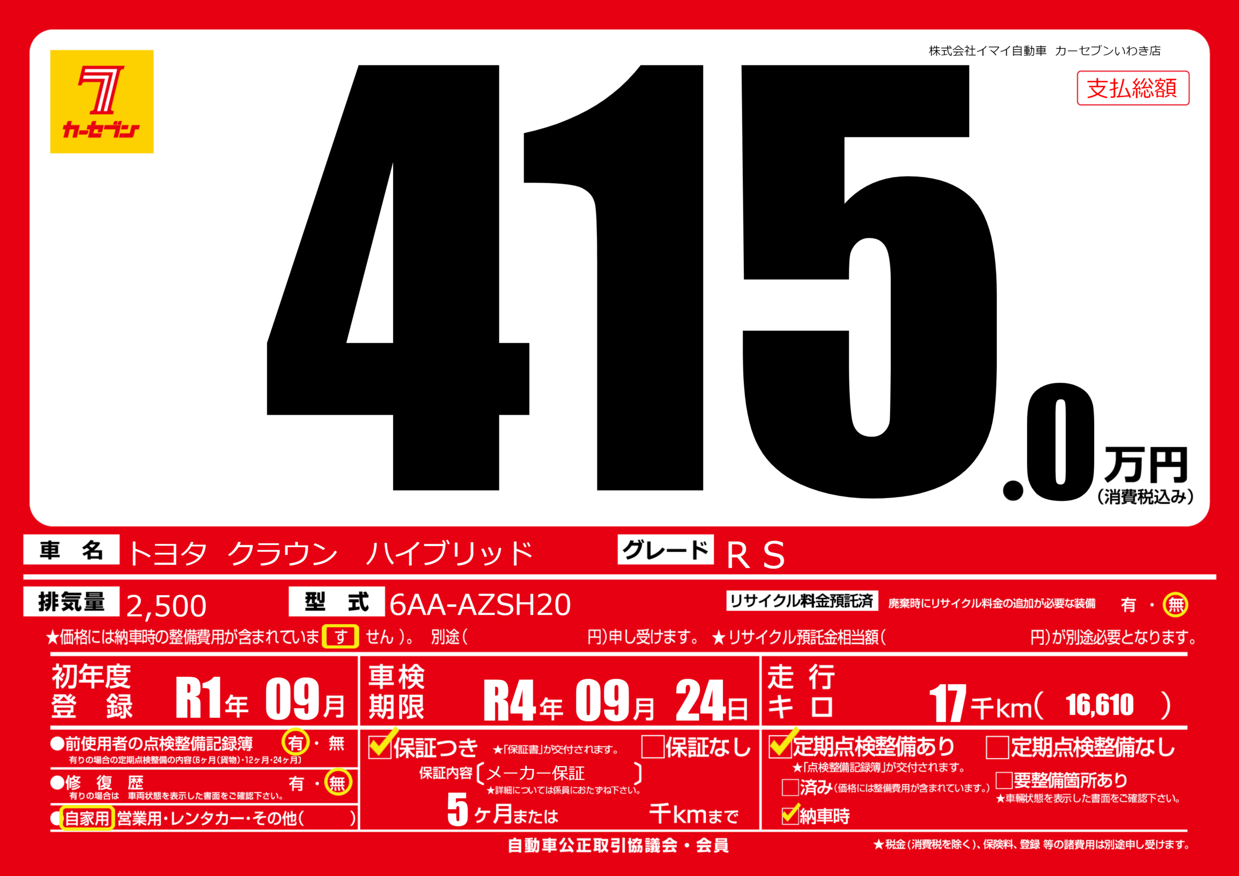 | 車名 | トヨタ クラウン ハイブリッド | グレード ミッション 排気量 |
