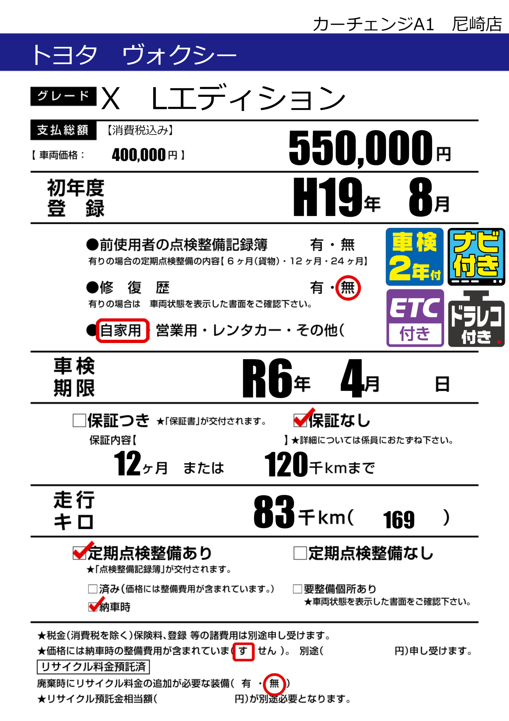 | 車名 | トヨタ ヴォクシー | グレード ミッション 排気量 |
