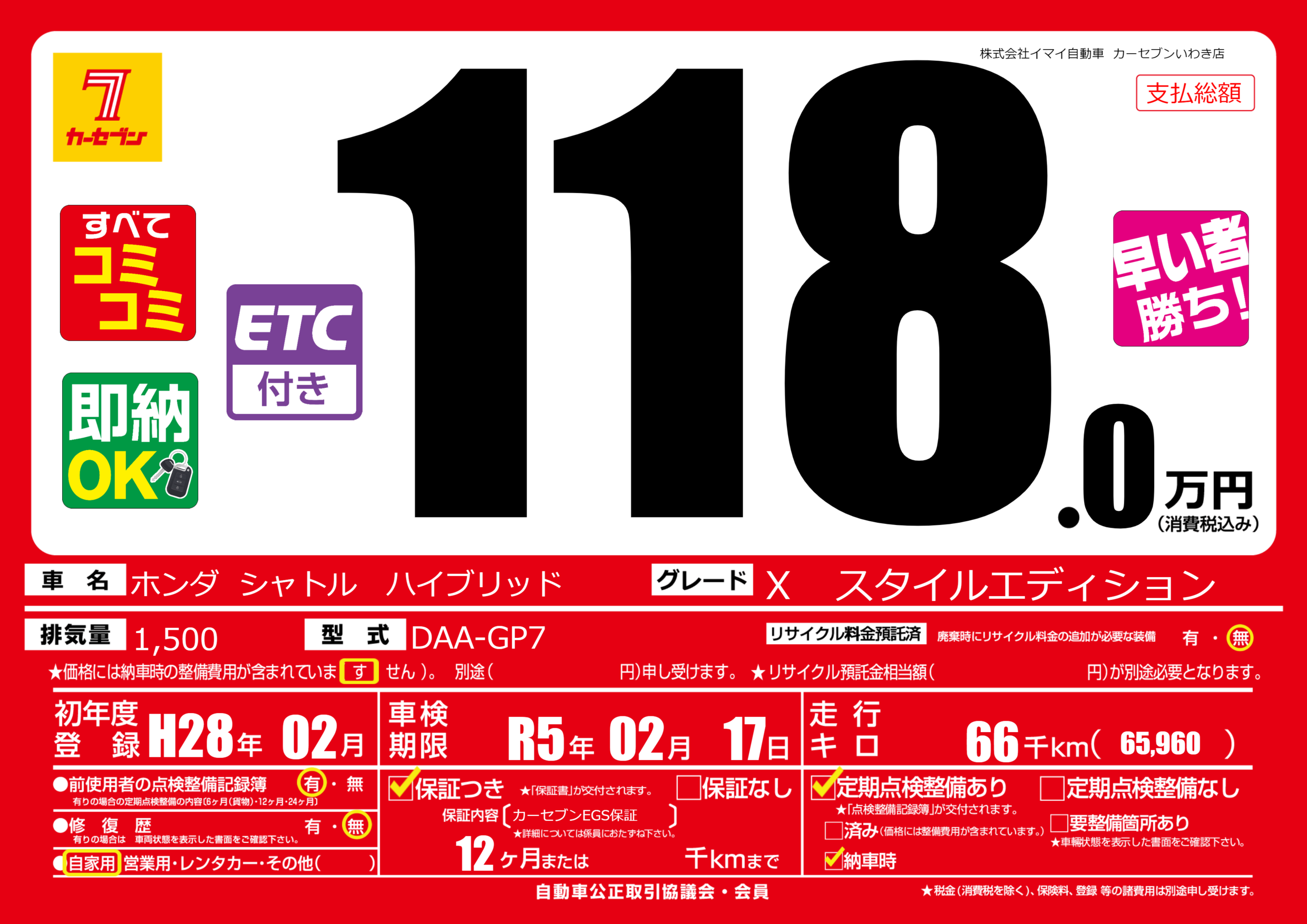 | 車検制限 | R5年 02月 17日 | ||