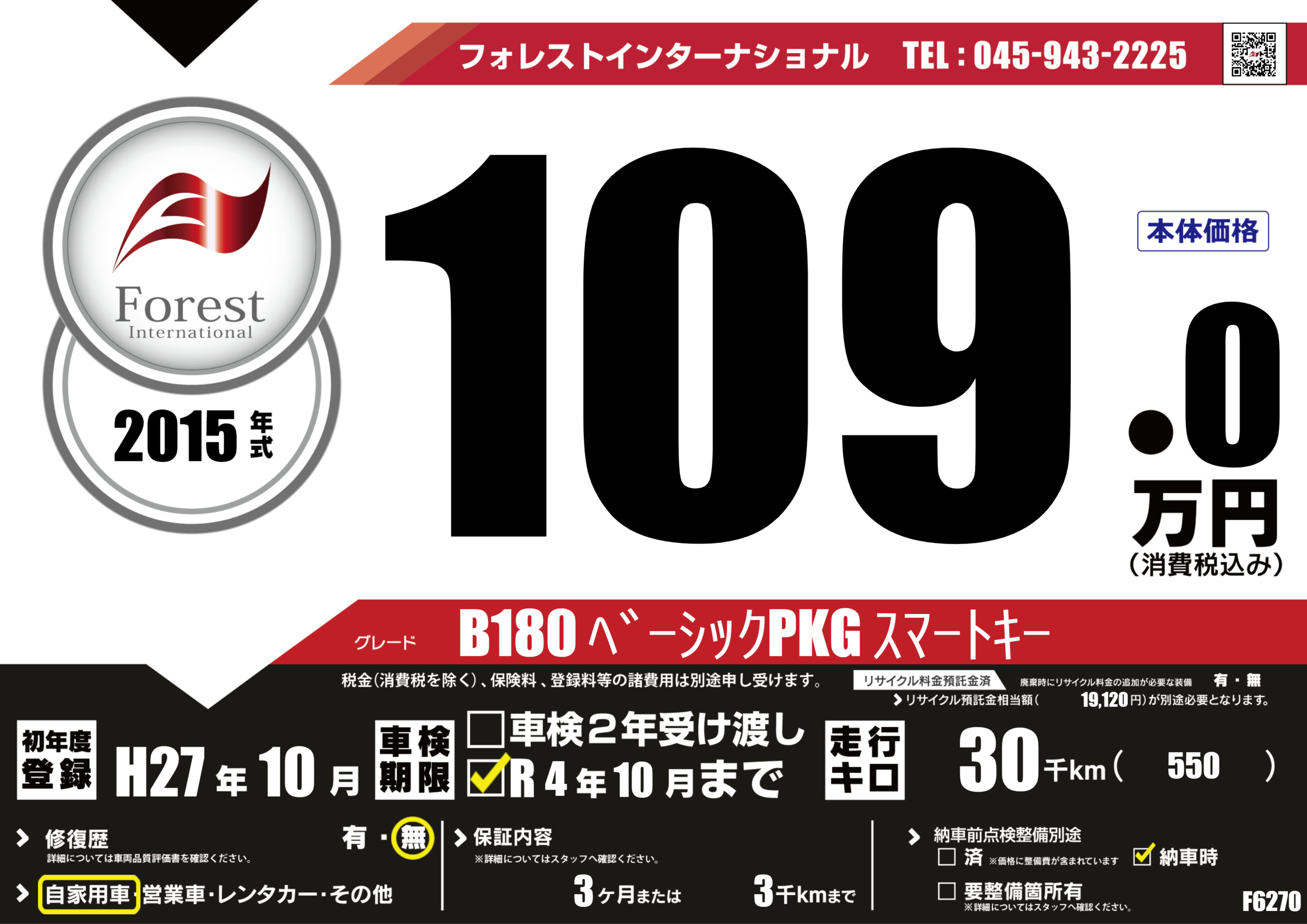 | 走行キロ | 3万km | 初年度登録 | H27年10月 |