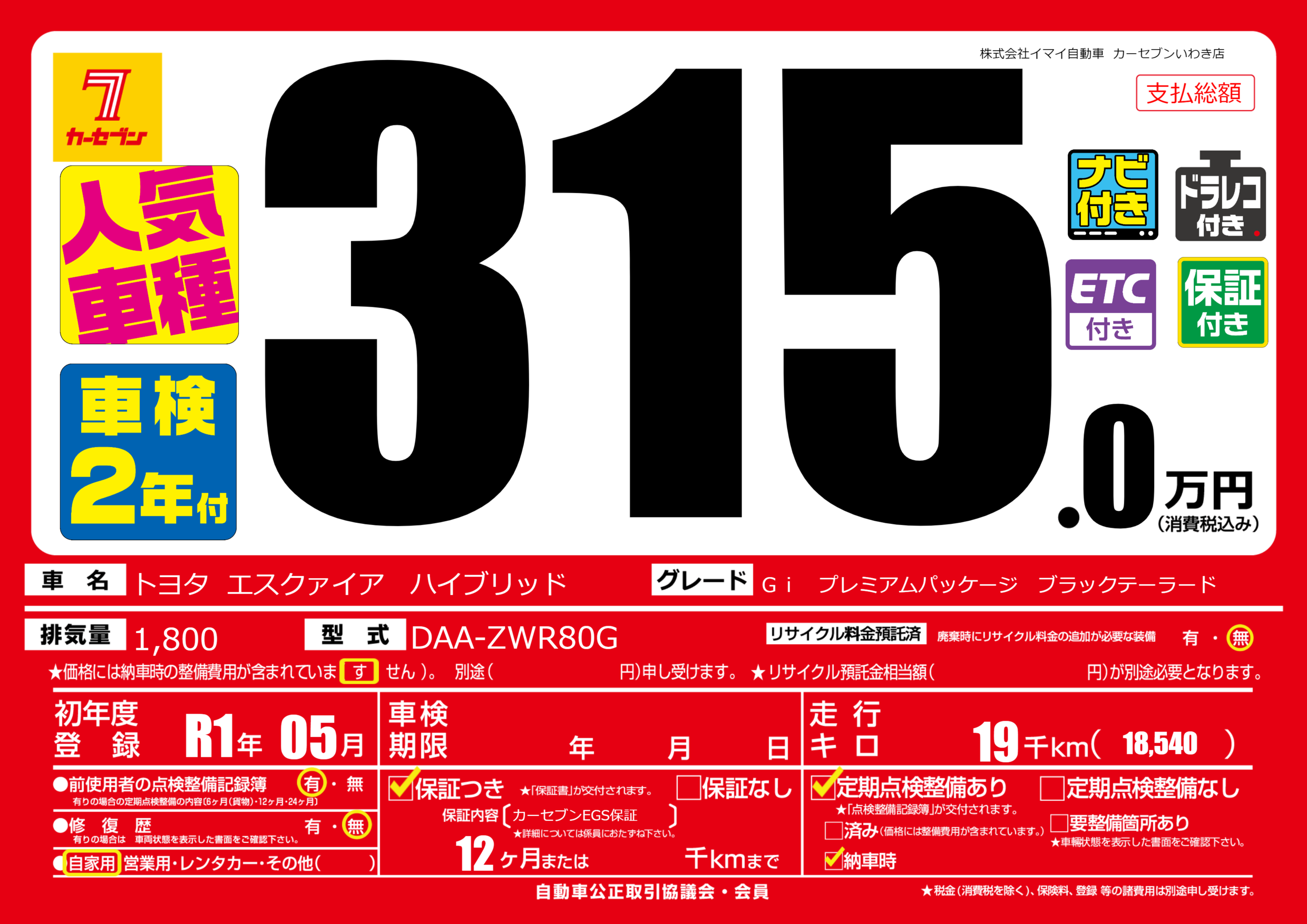 | 車名 | トヨタ エスクァイア ハイブリッド | グレード ミッション 排気量 |