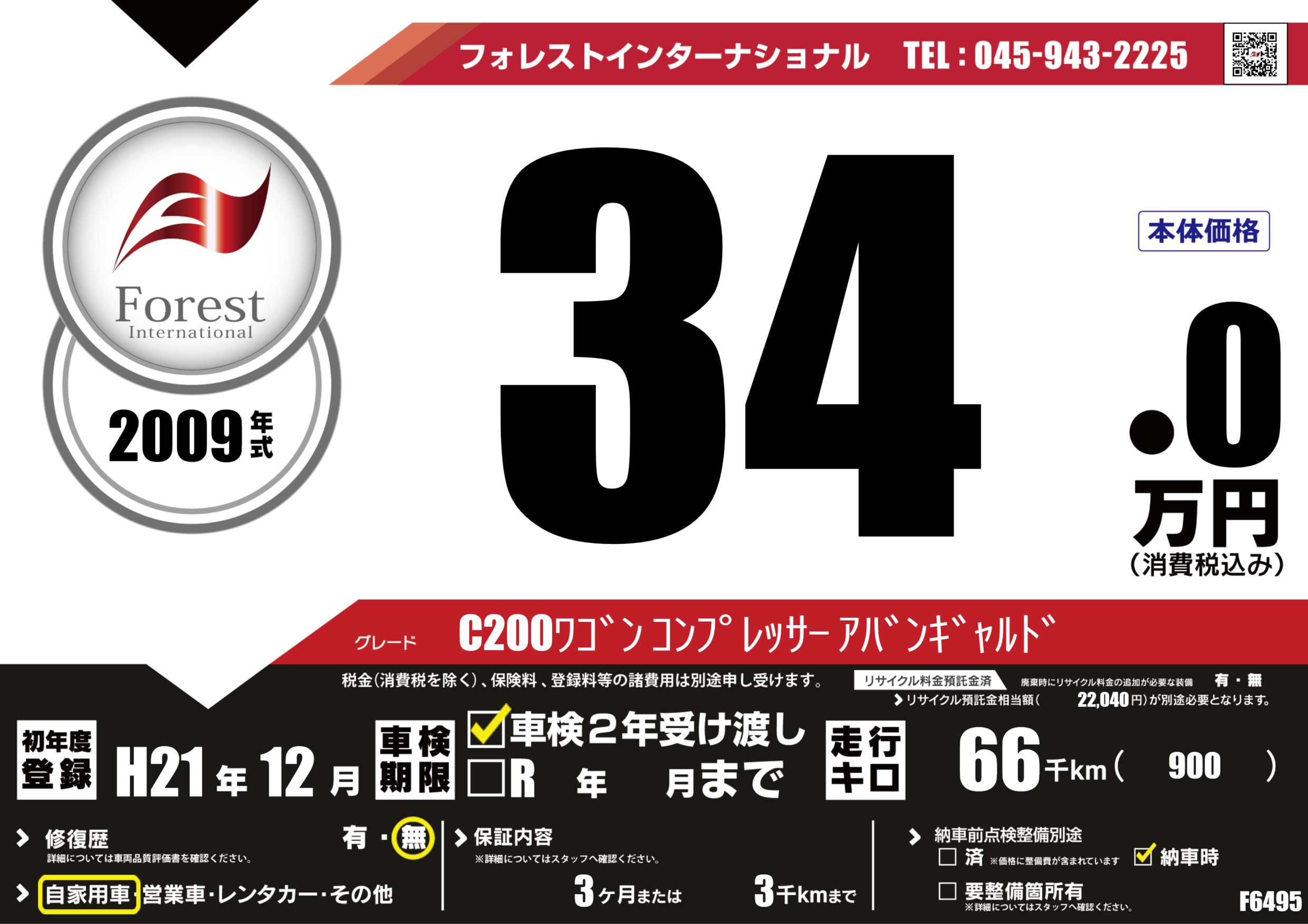 | 走行キロ | 6.6万km | 初年度登録 | H21年12月 |