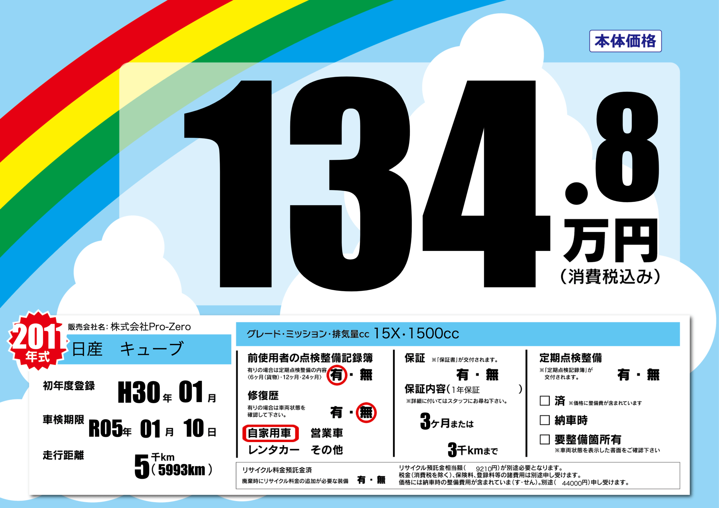 | 車名 | 日産 キューブ | グレード ミッション 排気量 |
