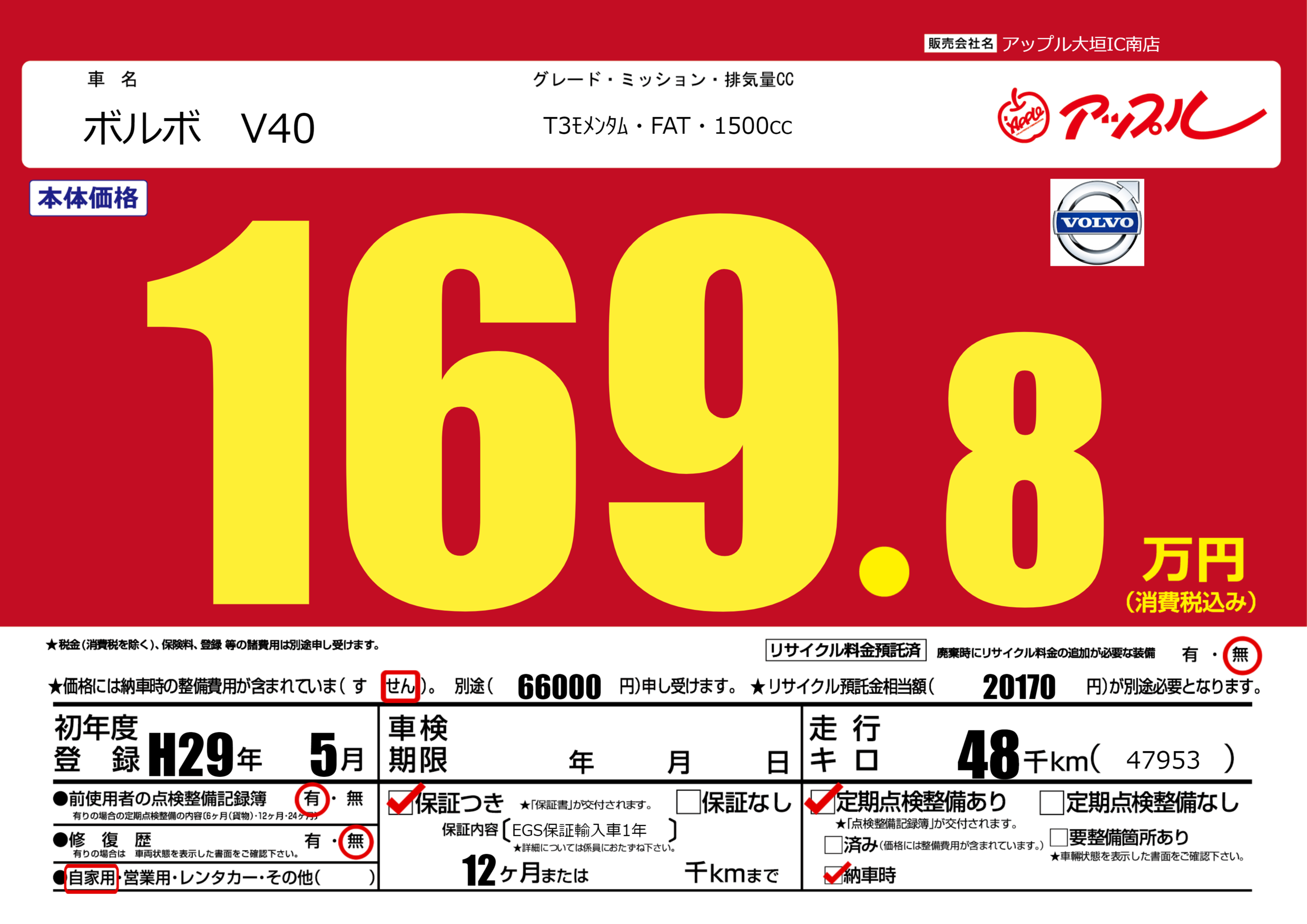 | 車名 | ボルボ V40 | グレード ミッション 排気量 |