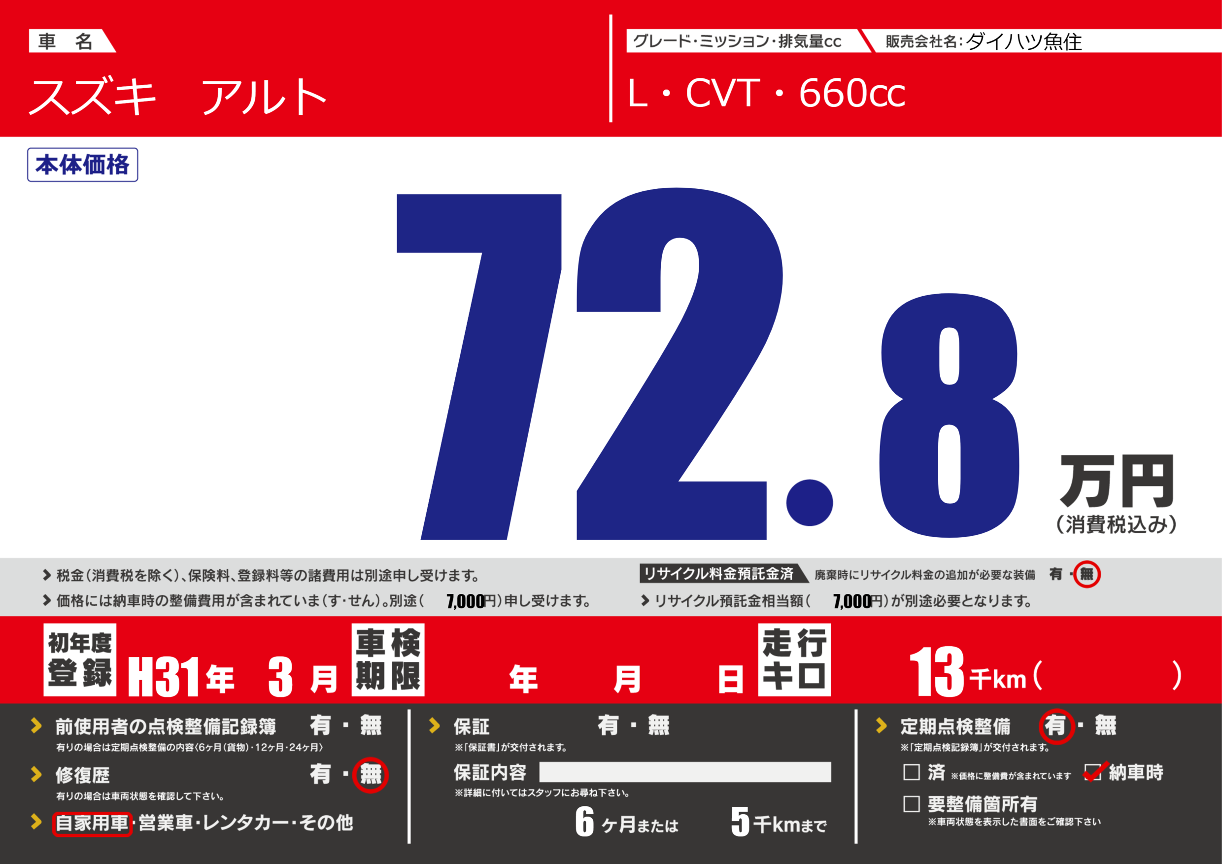 | 定期点検整備 | 定期点検整備あり 納車時あり | ||