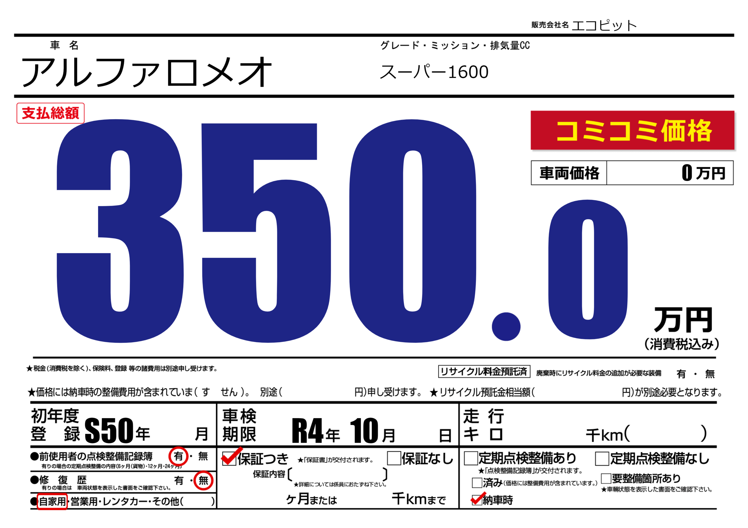 | 車名 | アルファロメオ | グレード ミッション 排気量 |