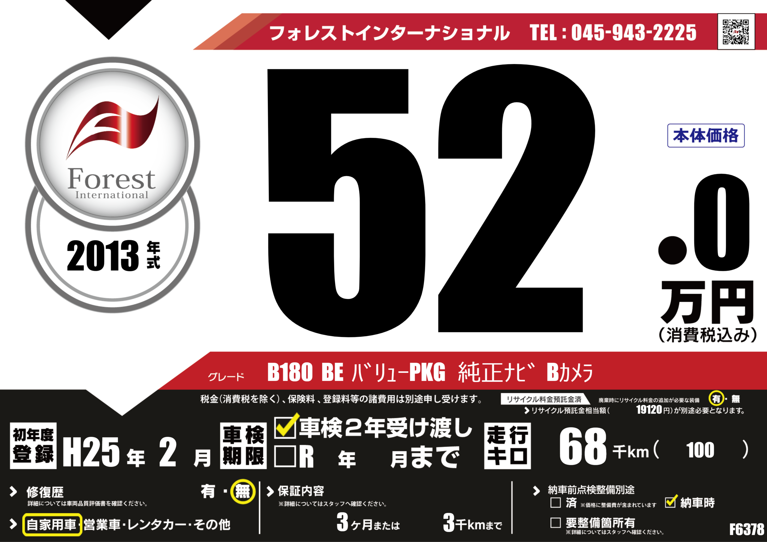 | 走行キロ | 6.8万km | 初年度登録 | H25年2月 |