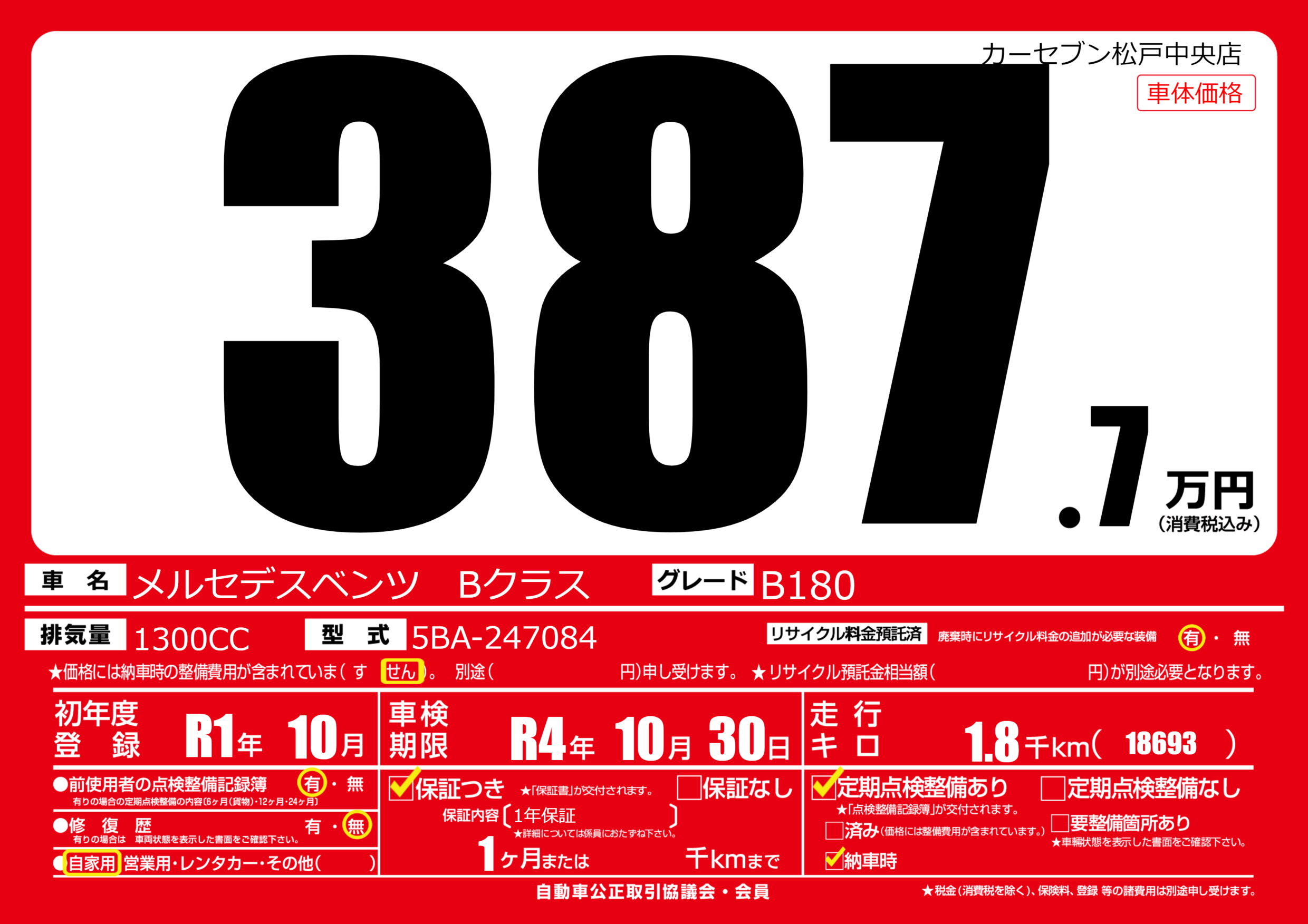| 車名 | メルセデスベンツ Bクラス | グレード ミッション 排気量 |