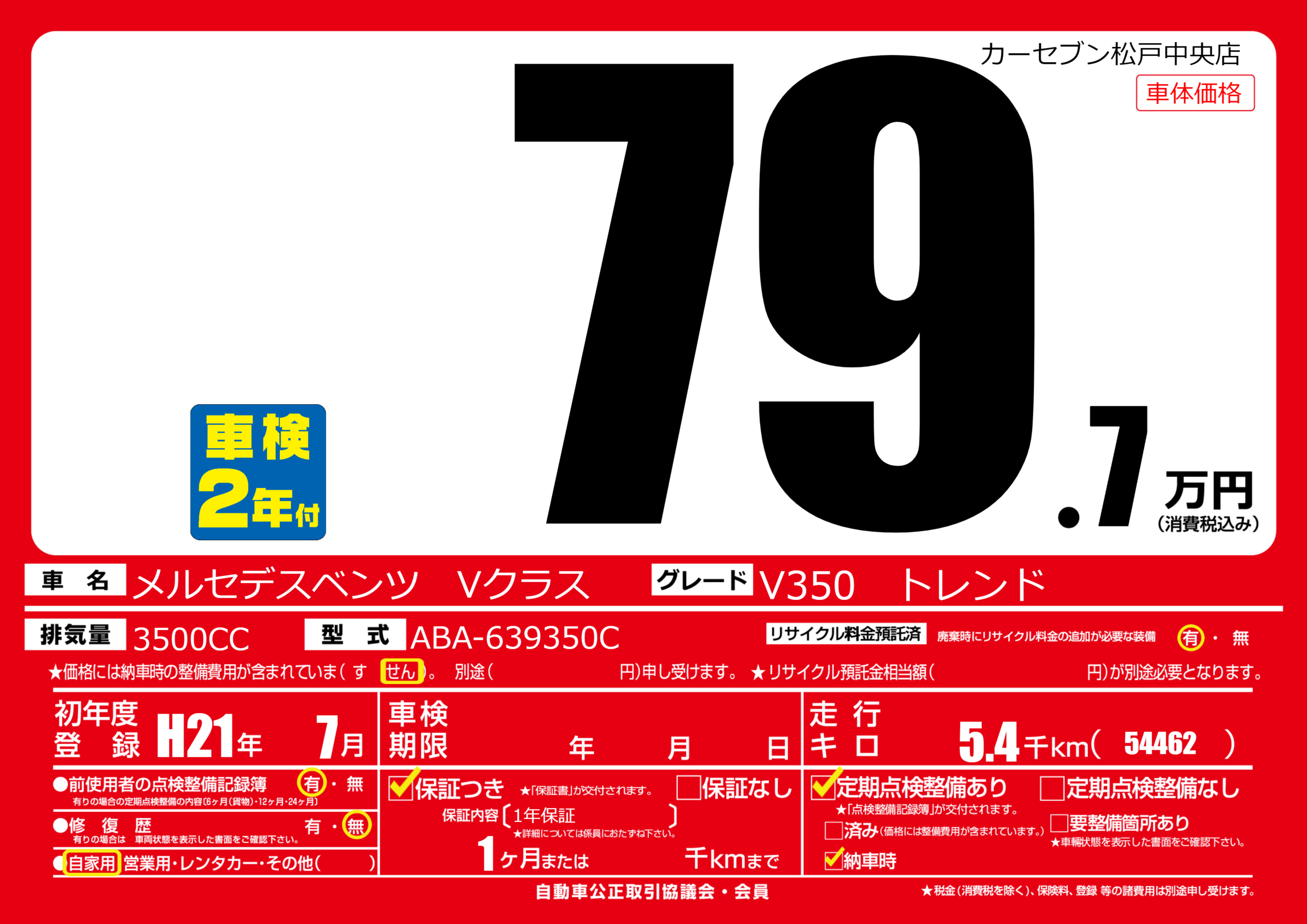 | 走行キロ | 0.5万km | 初年度登録 | H21年7月 |