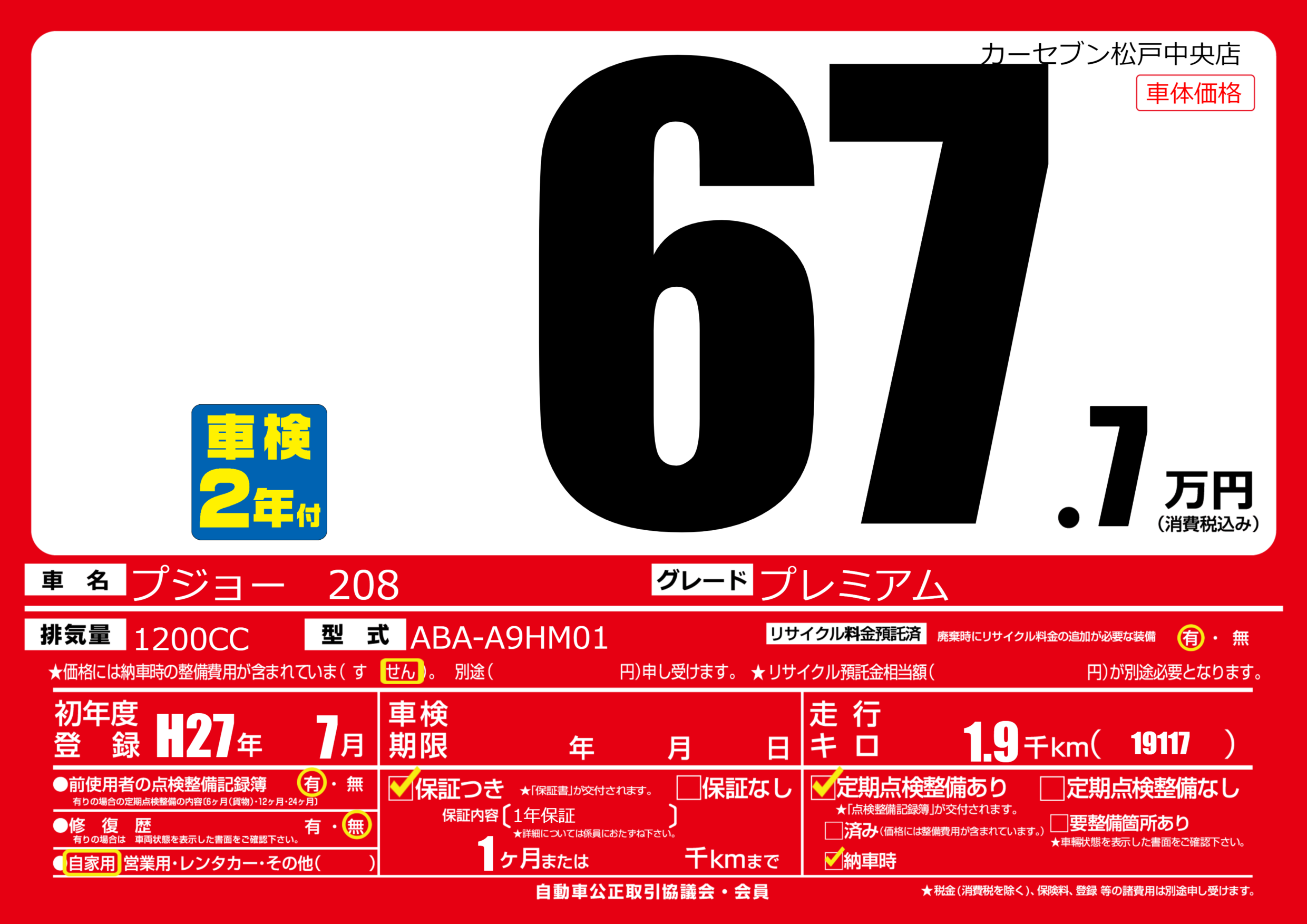 | 車名 | プジョー 208 | グレード ミッション 排気量 |