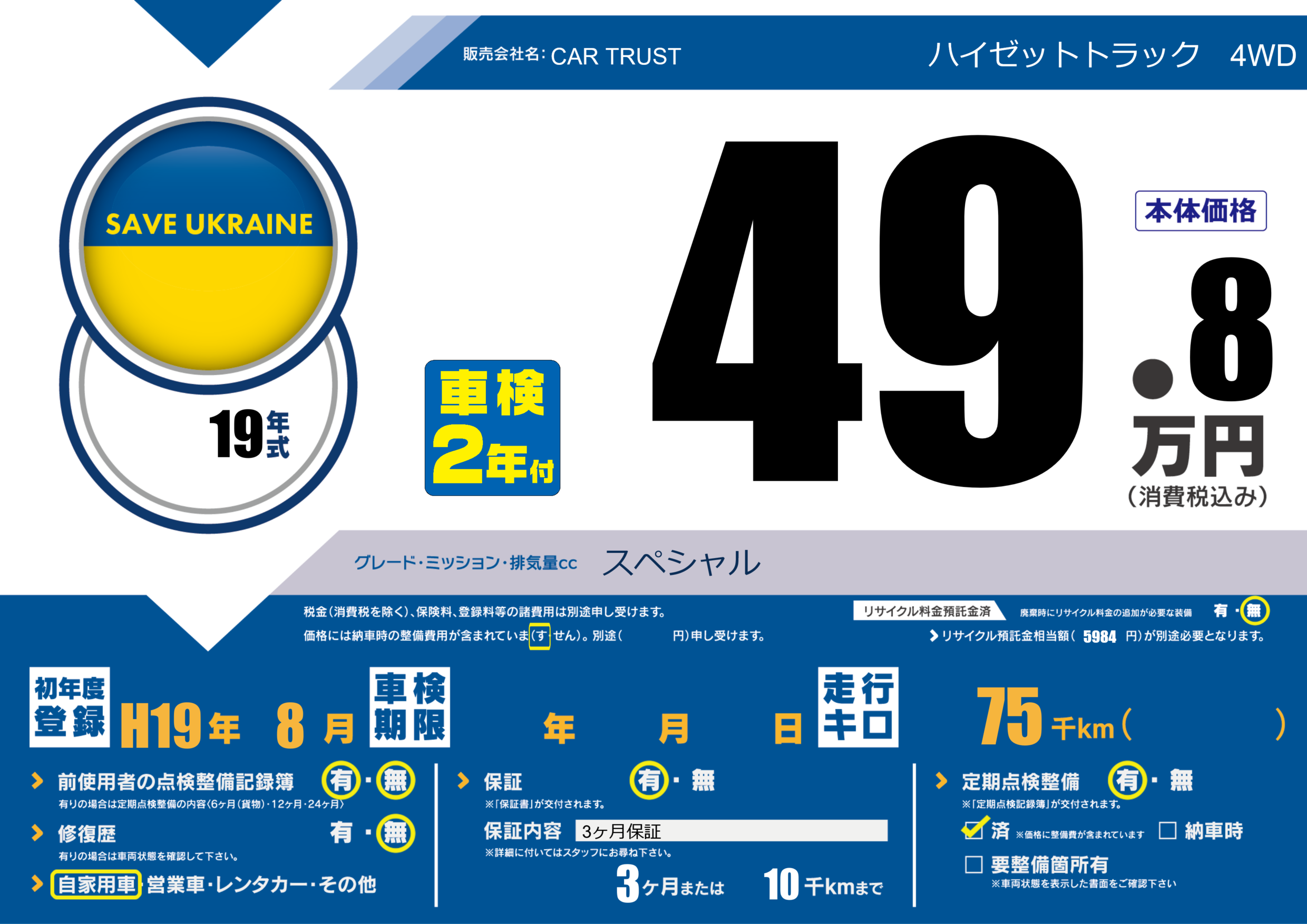 | 車名 | ハイゼットトラック 4WD | グレード ミッション 排気量 |