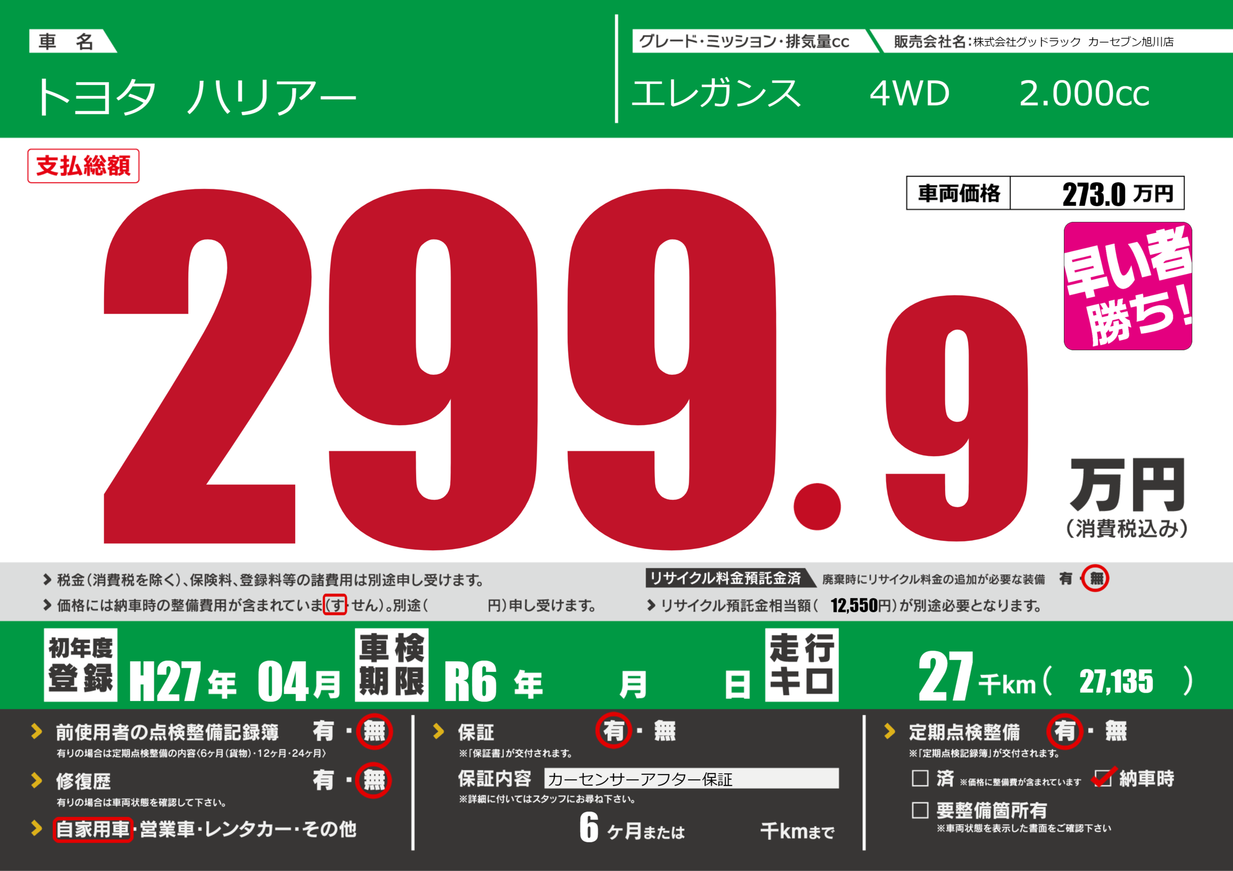 | 走行キロ | 2.7万km | 初年度登録 | H27年04月 |