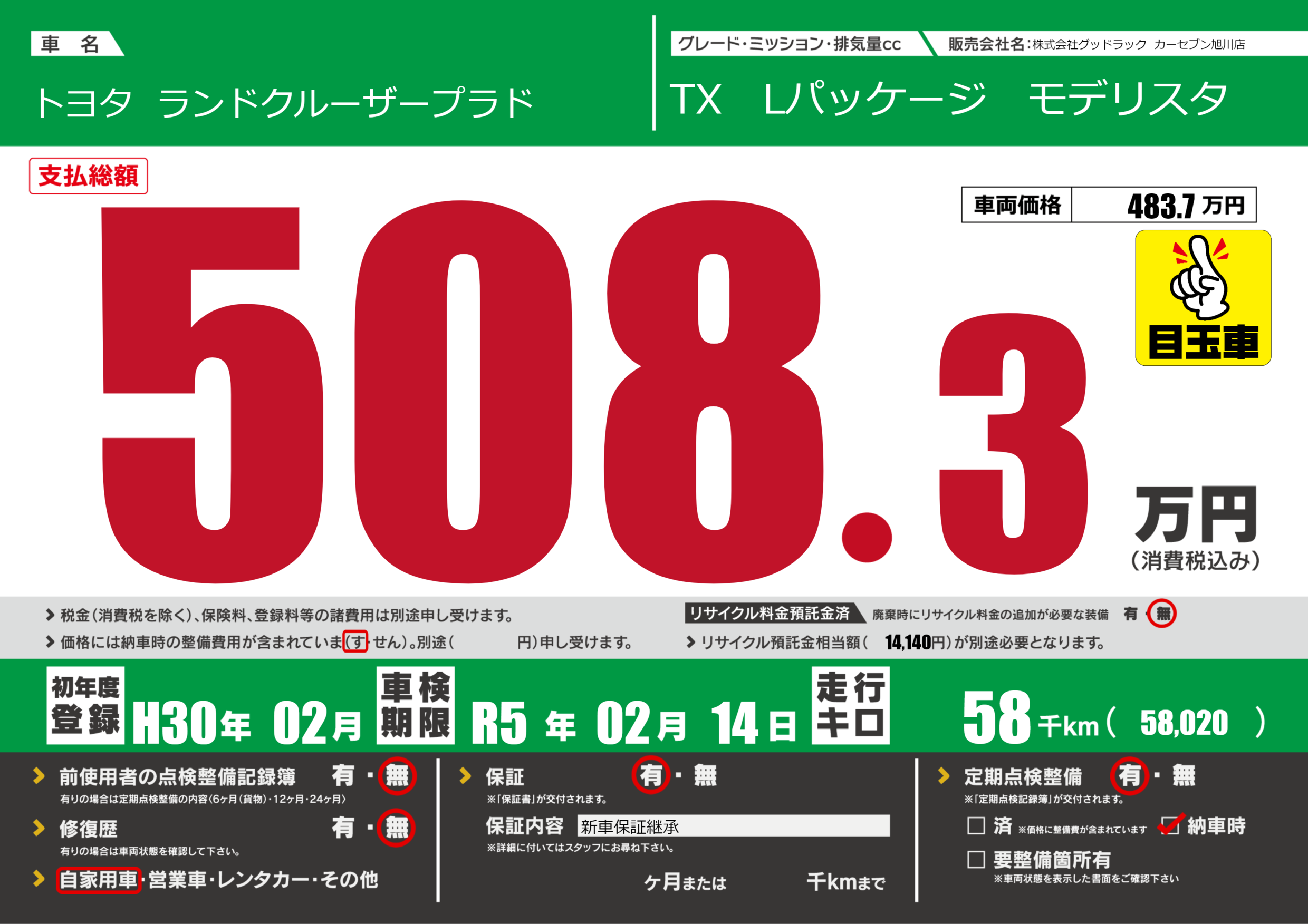 | 車名 | トヨタ ランドクルーザープラド | グレード ミッション 排気量 |