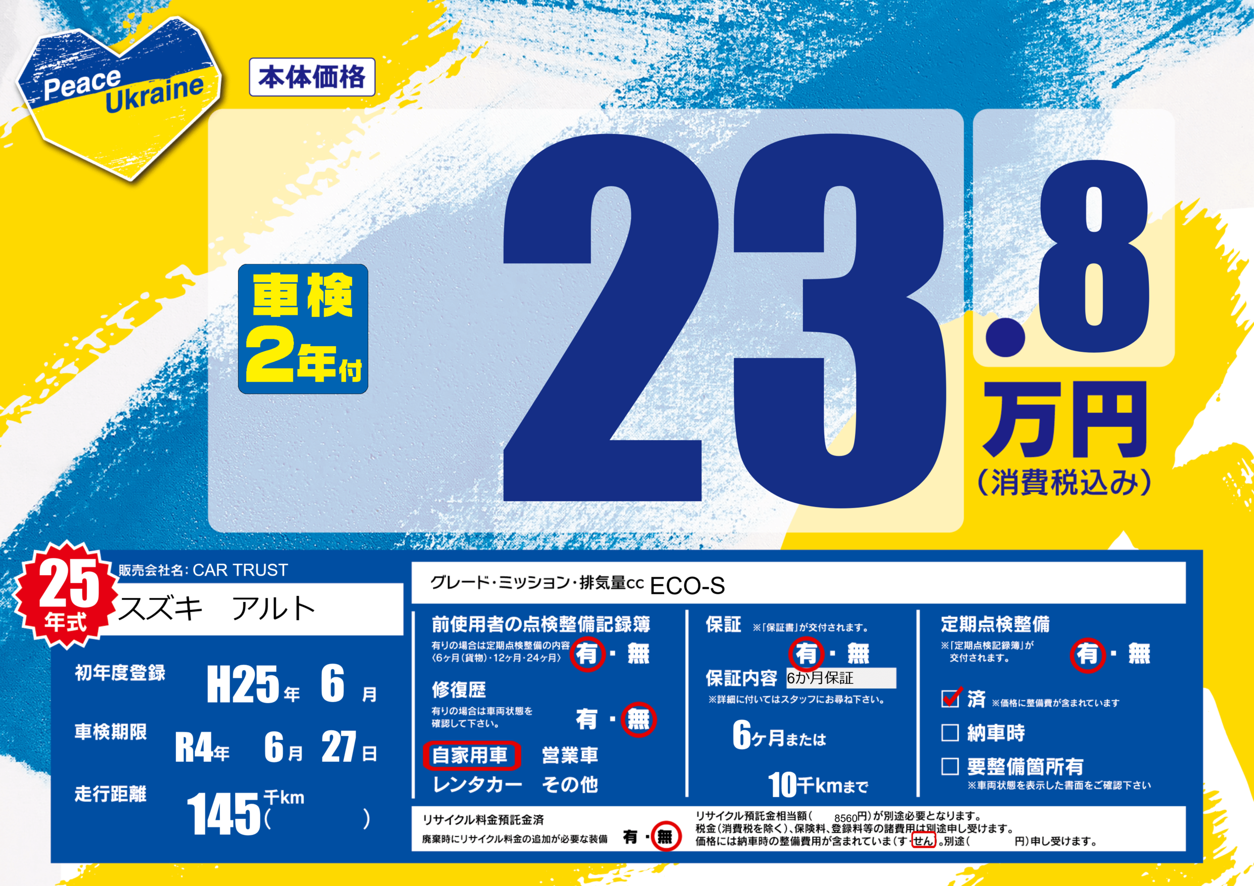 | 走行キロ | 14.5万km | 初年度登録 | H25年6月 |