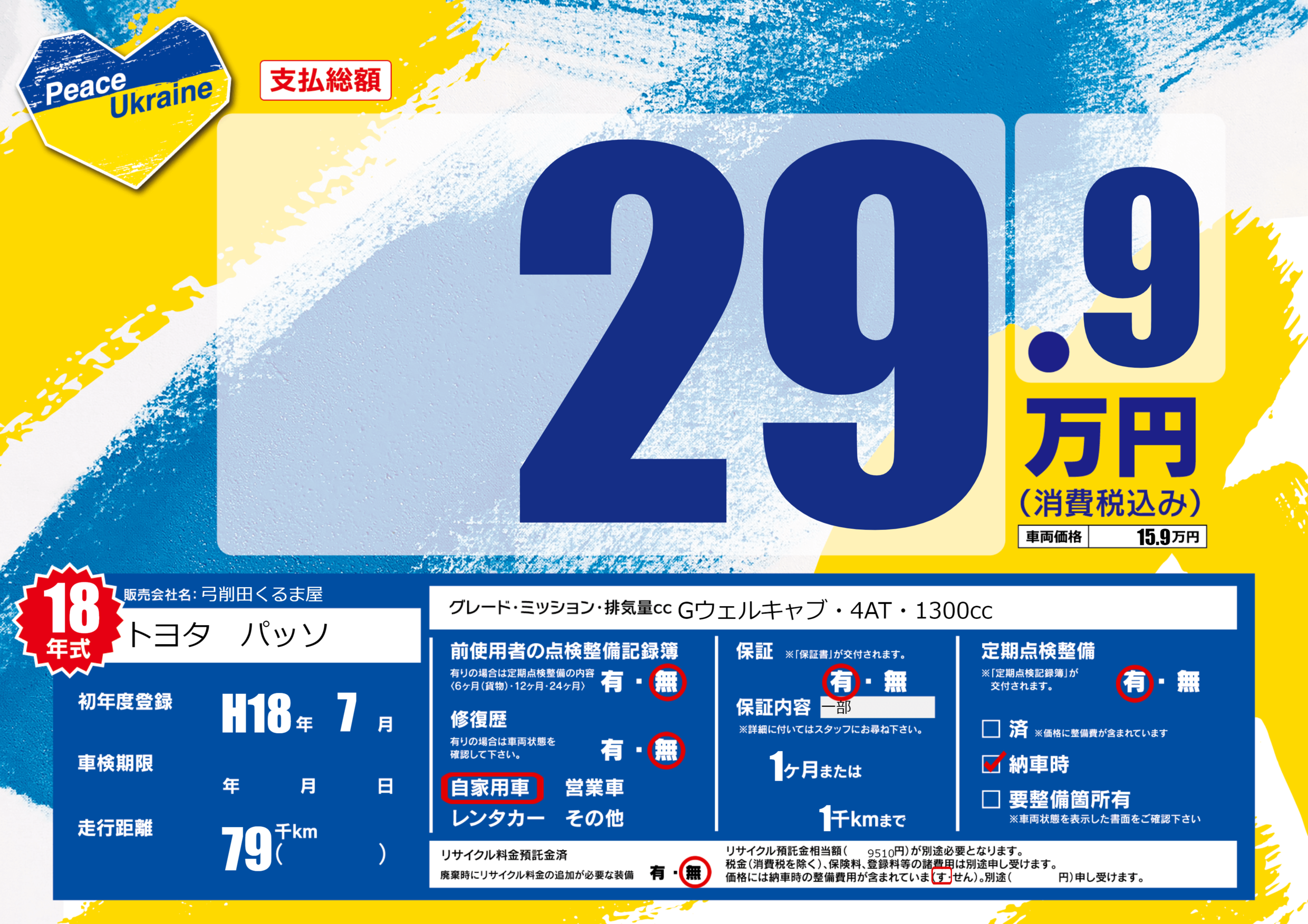 | 車名 | トヨタ パッソ | グレード ミッション 排気量 |