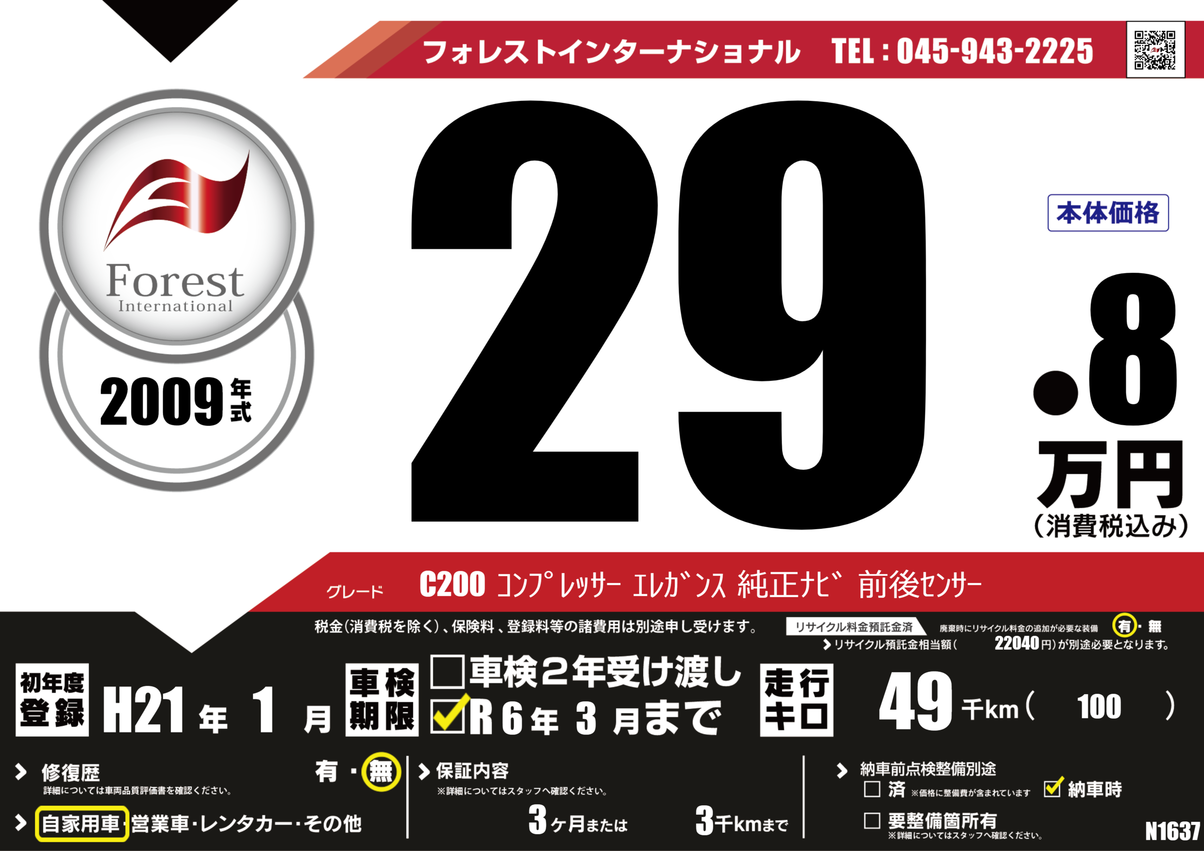 C200 コンプレッサー エレガンス 純正ナビ 前後センサー |
