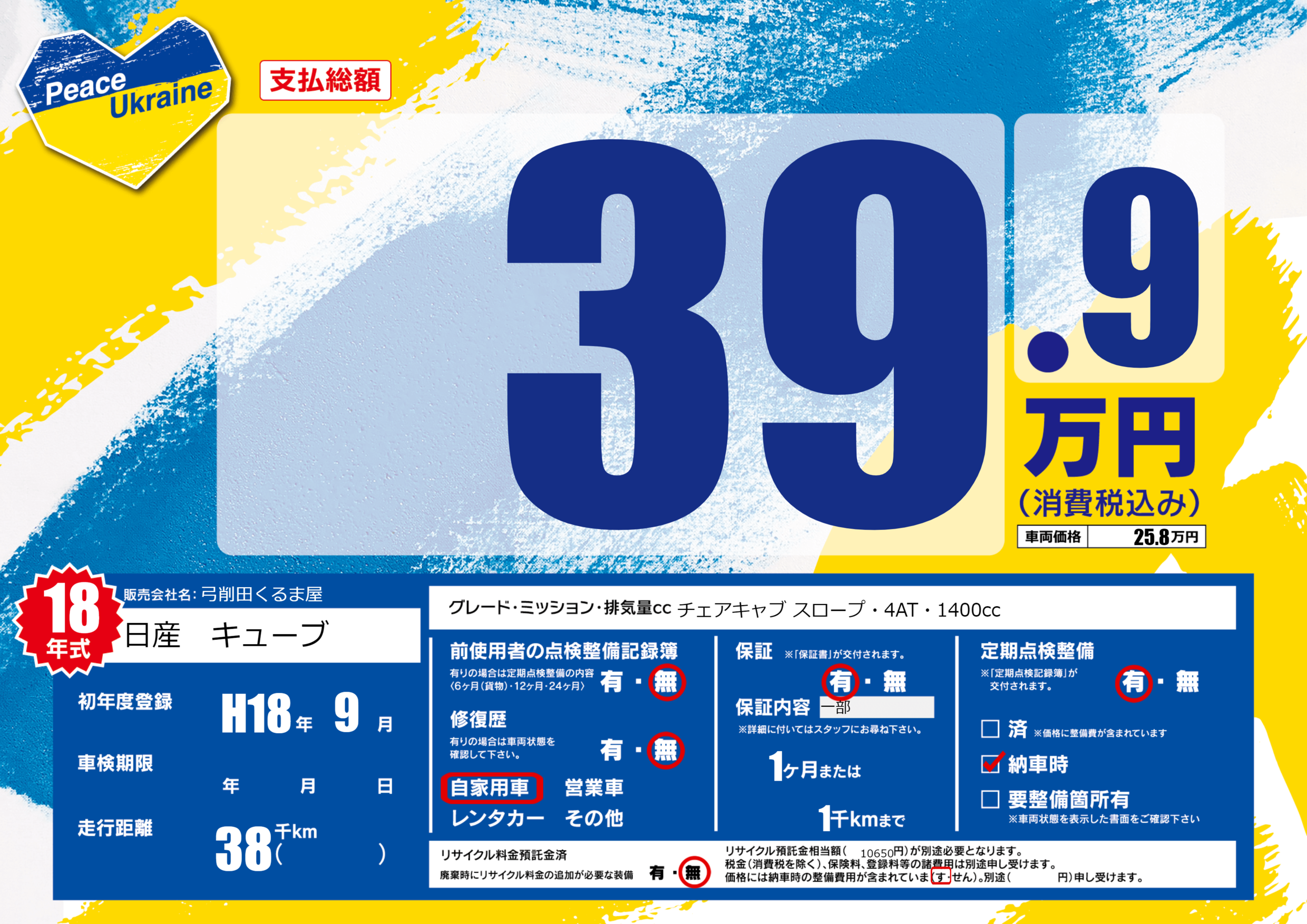 | 車名 | 日産 キューブ | グレード ミッション 排気量 |