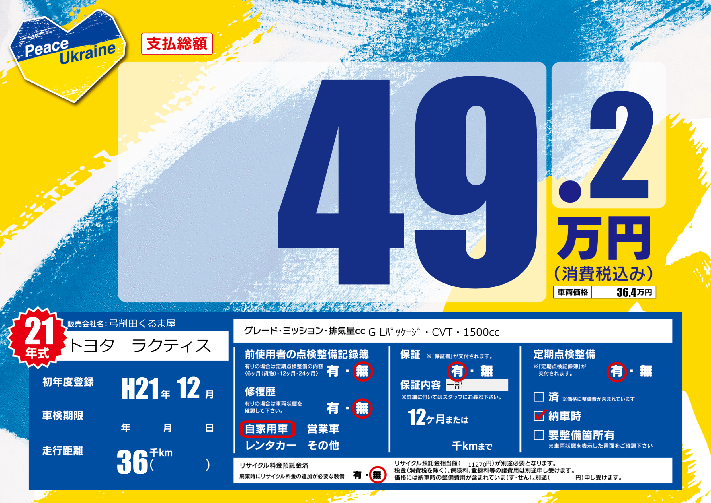 | 車名 | トヨタ ラクティス | グレード ミッション 排気量 |