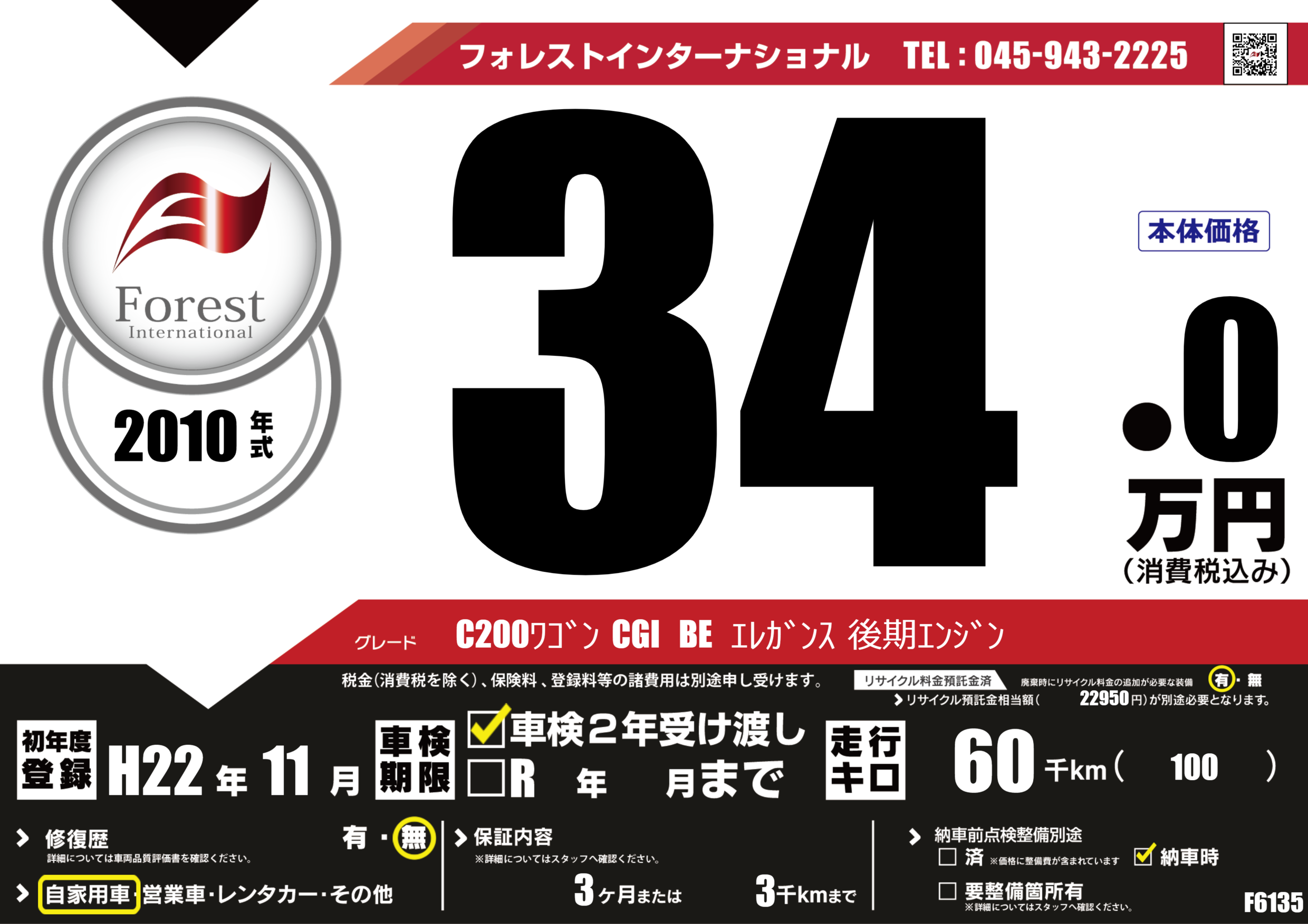 | 走行キロ | 6万km | 初年度登録 | H22年11月 |