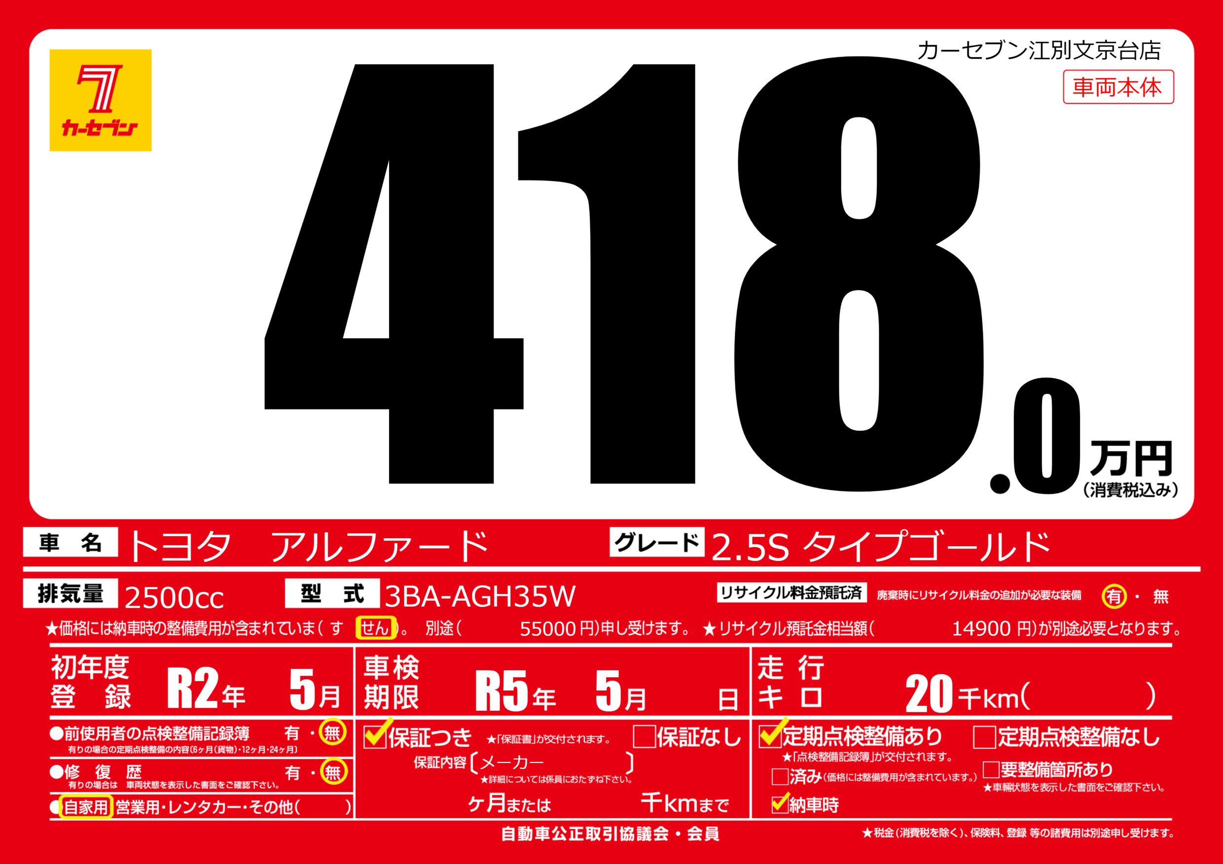 | 車名 | トヨタ アルファード | グレード ミッション 排気量 |