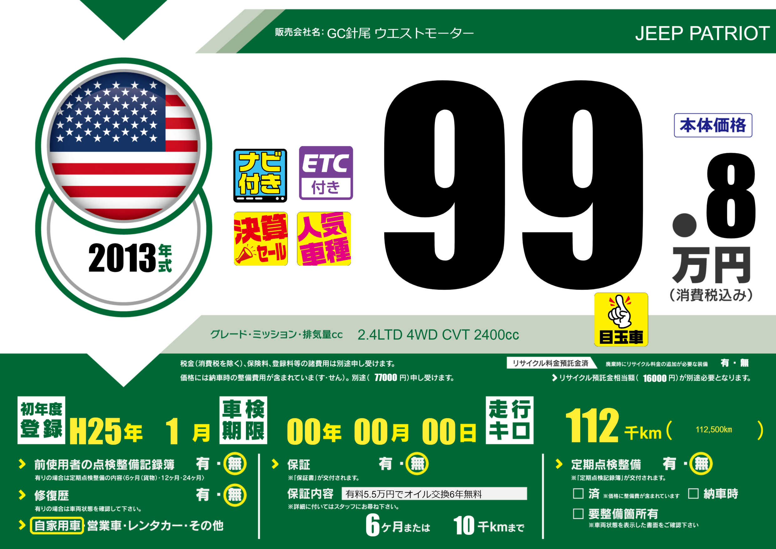 | 車名 | JEEP PATRIOT | グレード ミッション 排気量 |