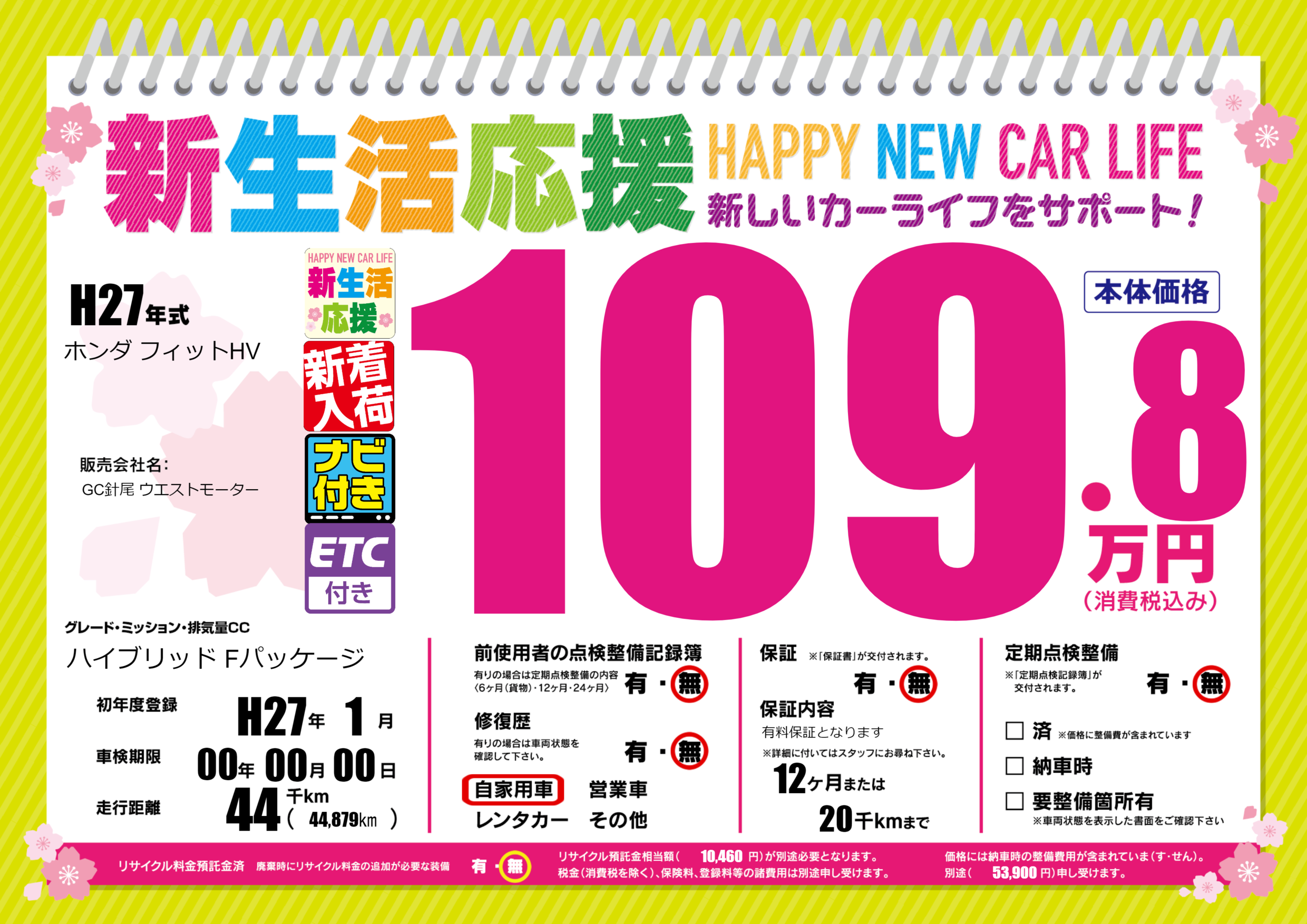 | 車名 | ホンダ フィットHV | グレード ミッション 排気量 |