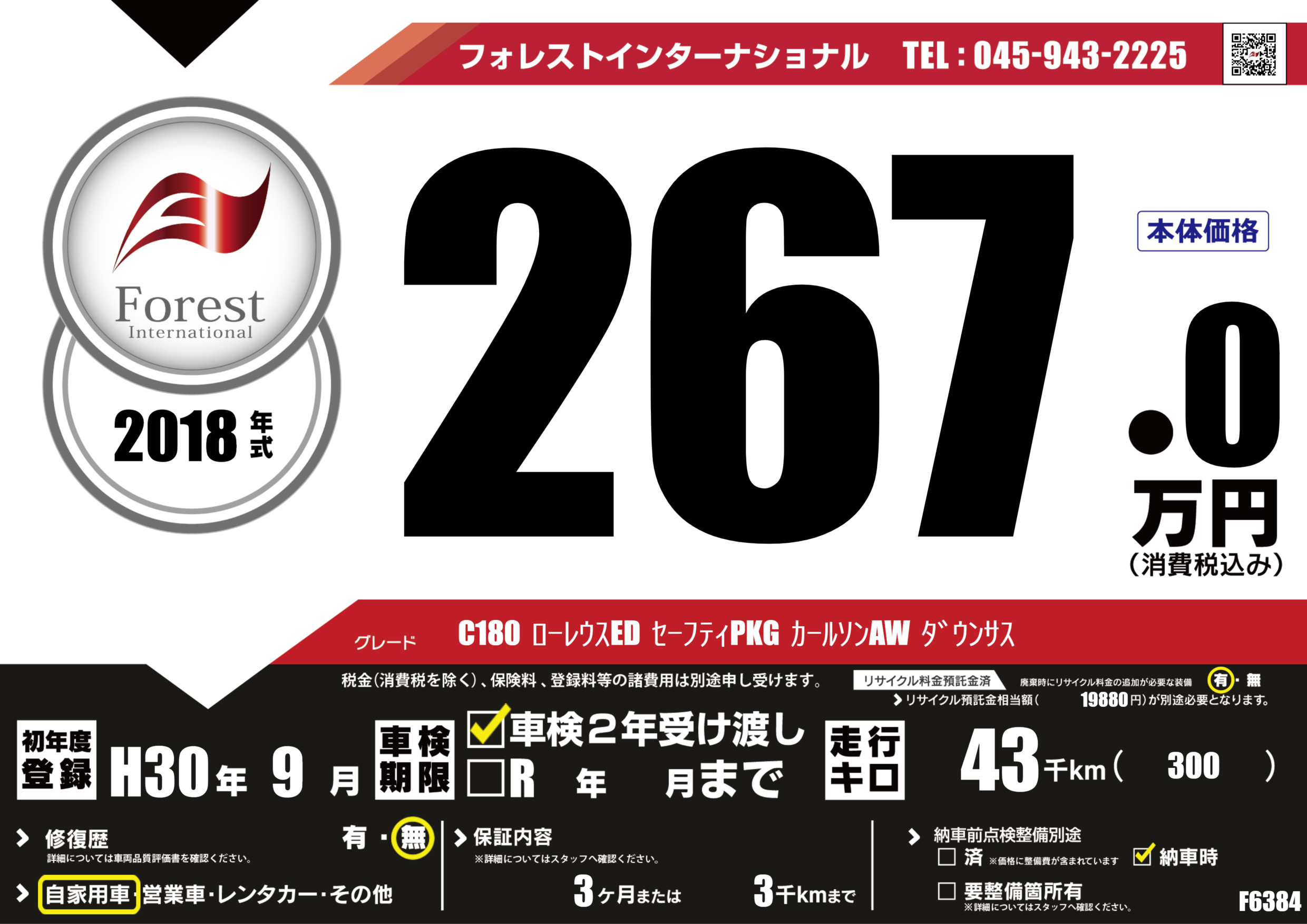 | 走行キロ | 4.3万km | 初年度登録 | H30年9月 |