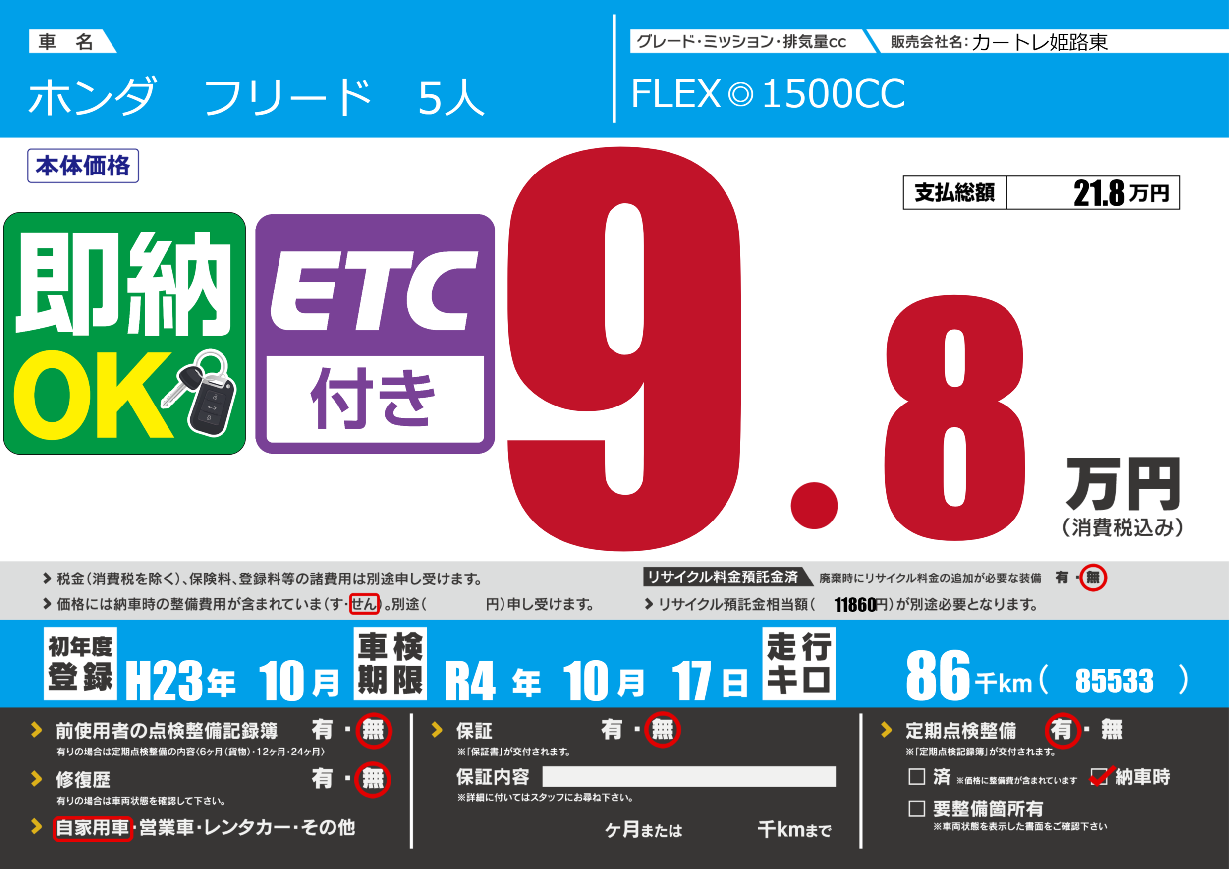 | 車名 | ホンダ フリード 5人 | グレード ミッション 排気量 |