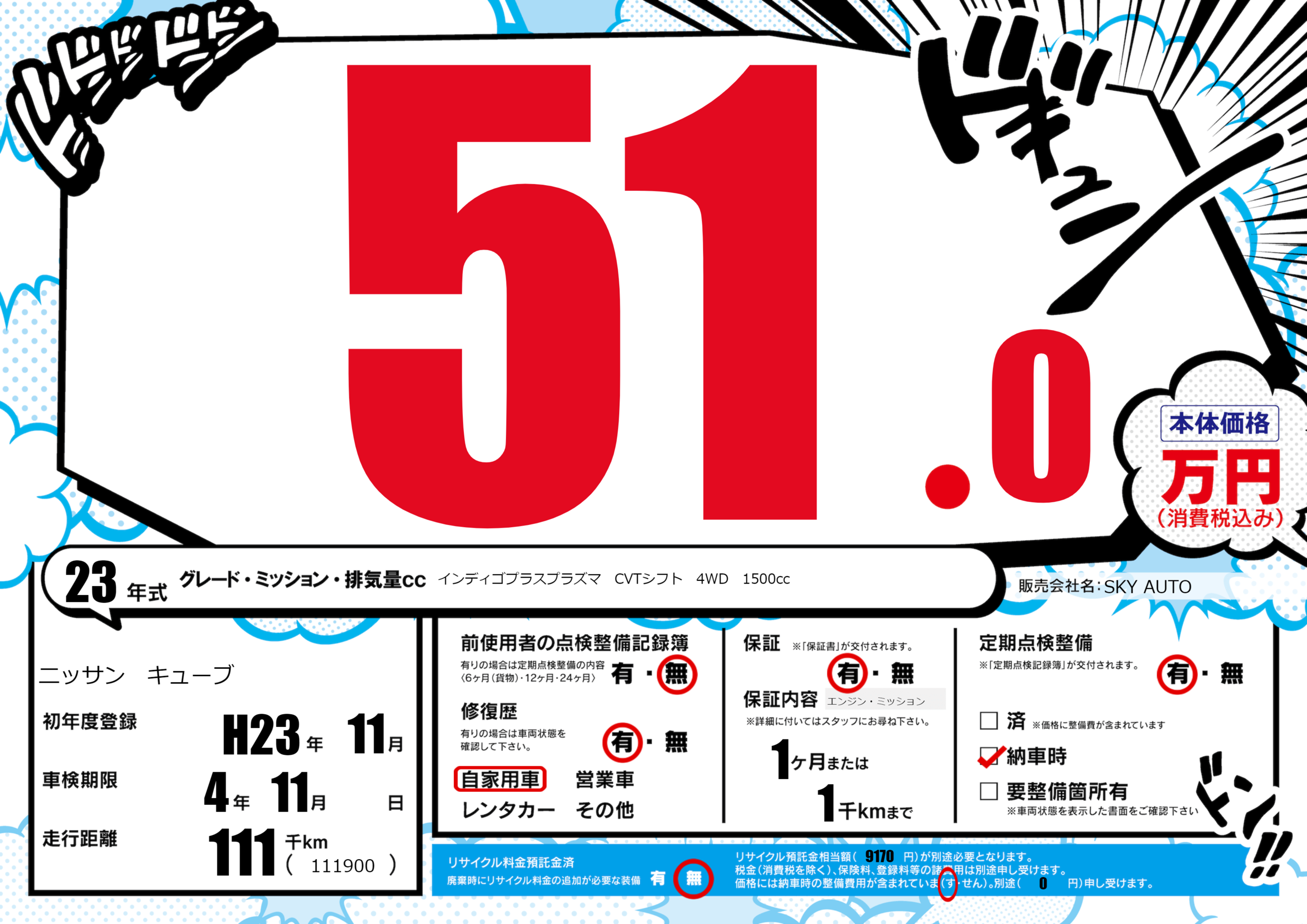 | 車名 | ニッサン キューブ | グレード ミッション 排気量 |