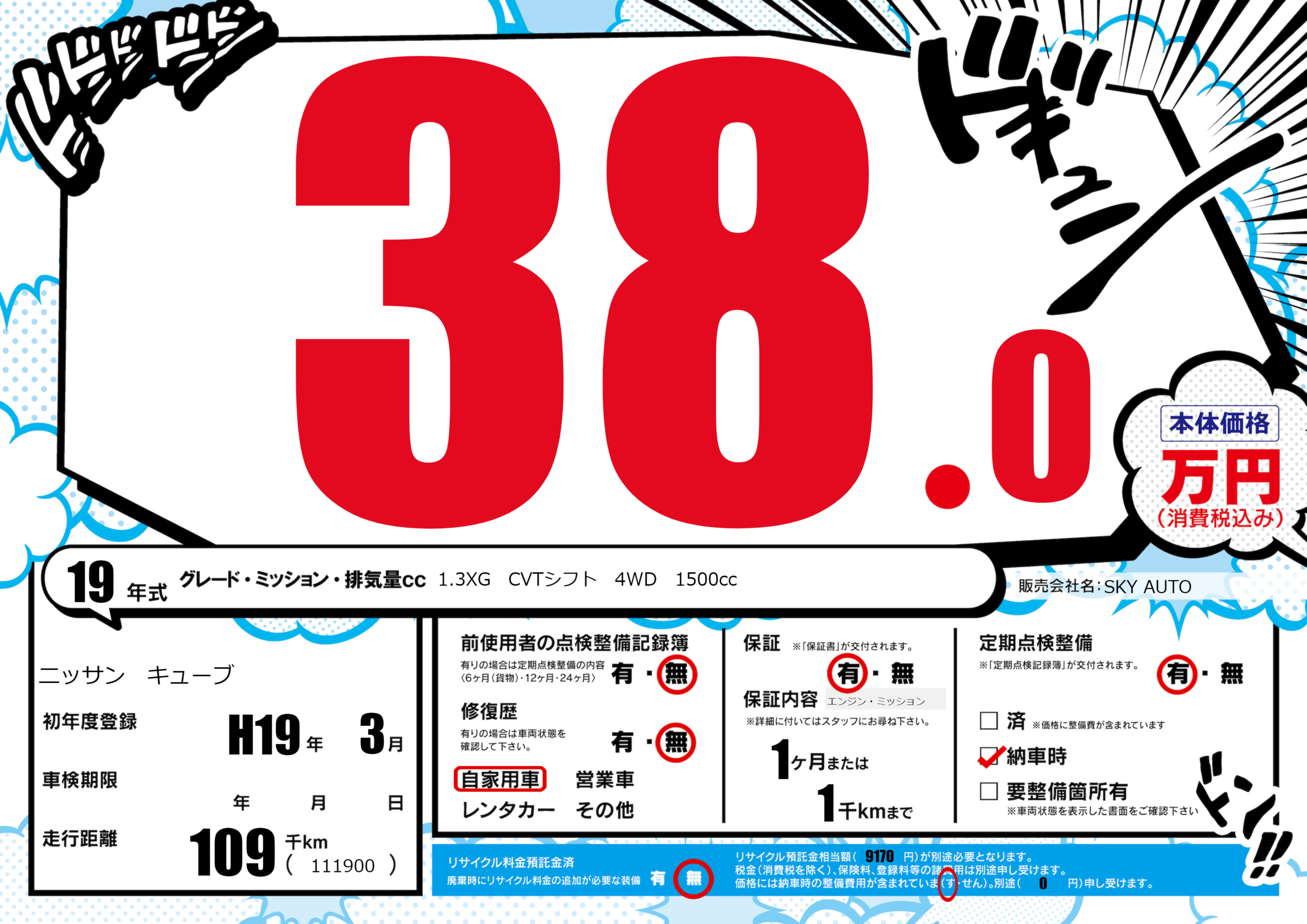 | 車名 | ニッサン キューブ | グレード ミッション 排気量 |