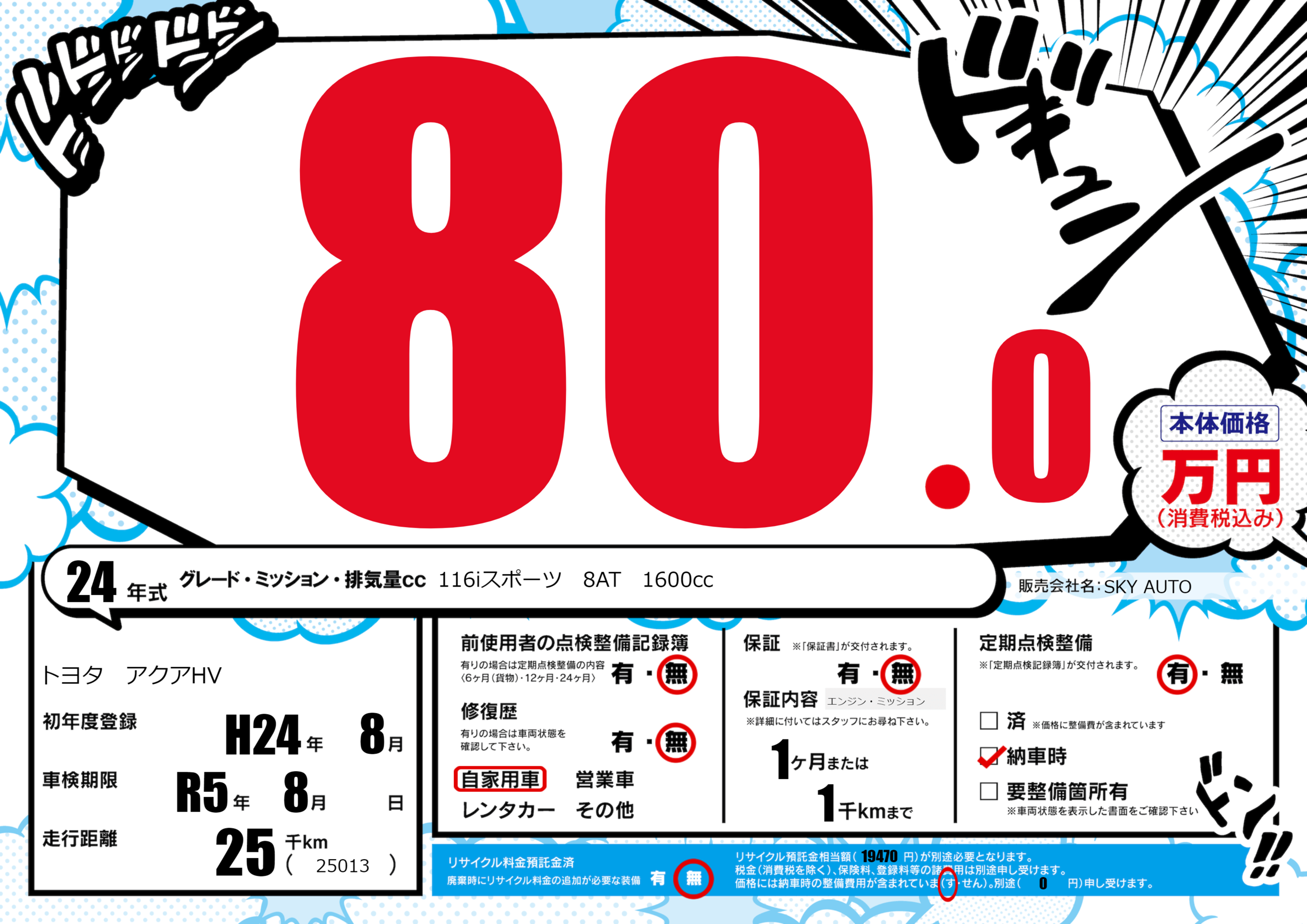 | 走行キロ | 2.5万km | 初年度登録 | H24年8月 |