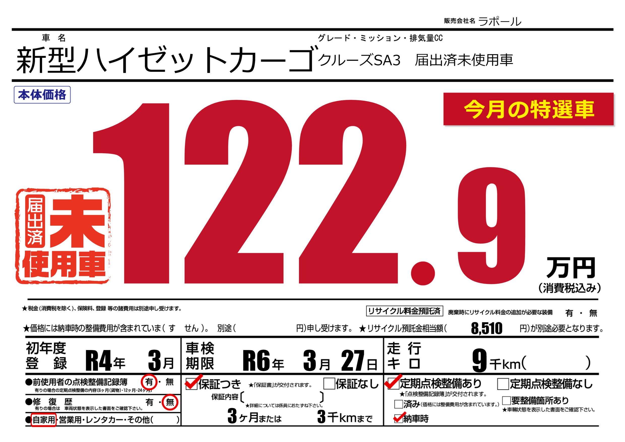 | 車名 | 新型ハイゼットカーゴ | グレード ミッション 排気量 |