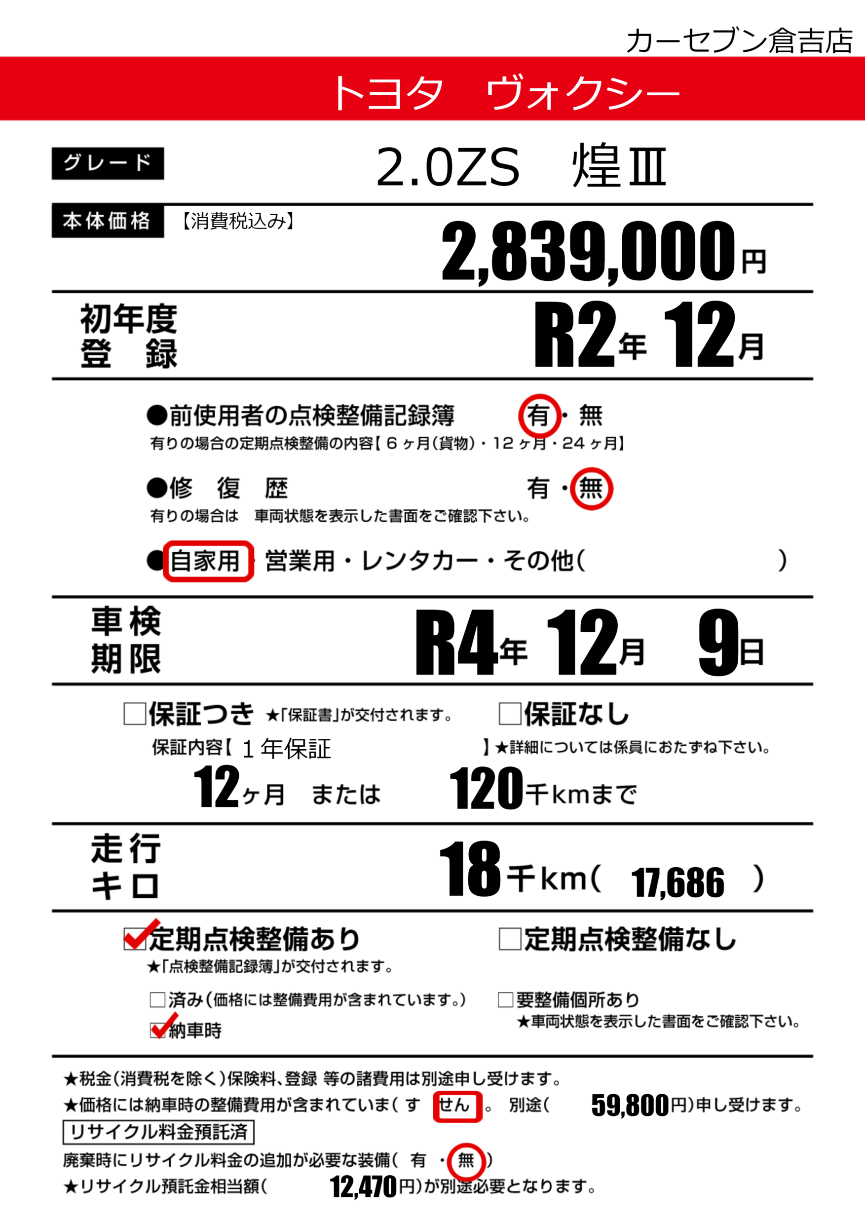 | 車名 | トヨタ ヴォクシー | グレード ミッション 排気量 |
