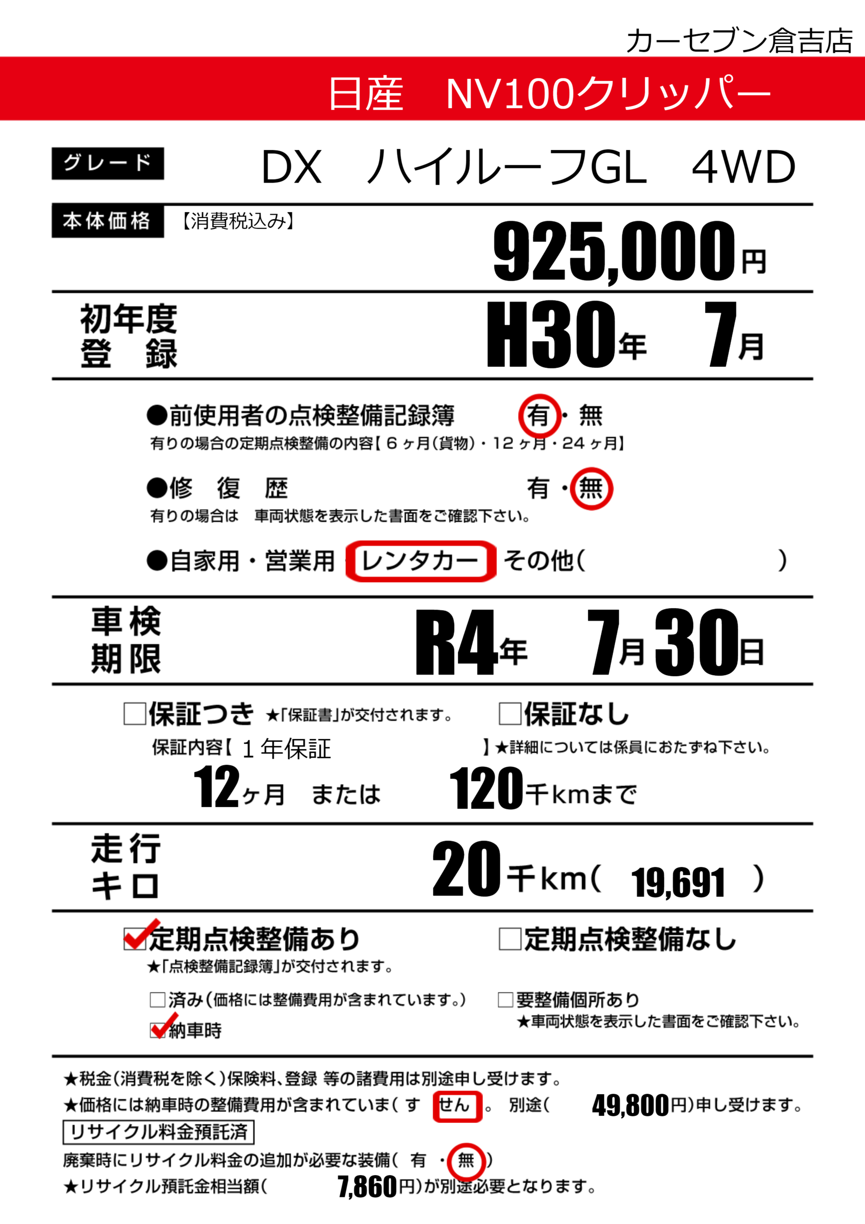 | 車検制限 | R4年 7月 30日 | ||