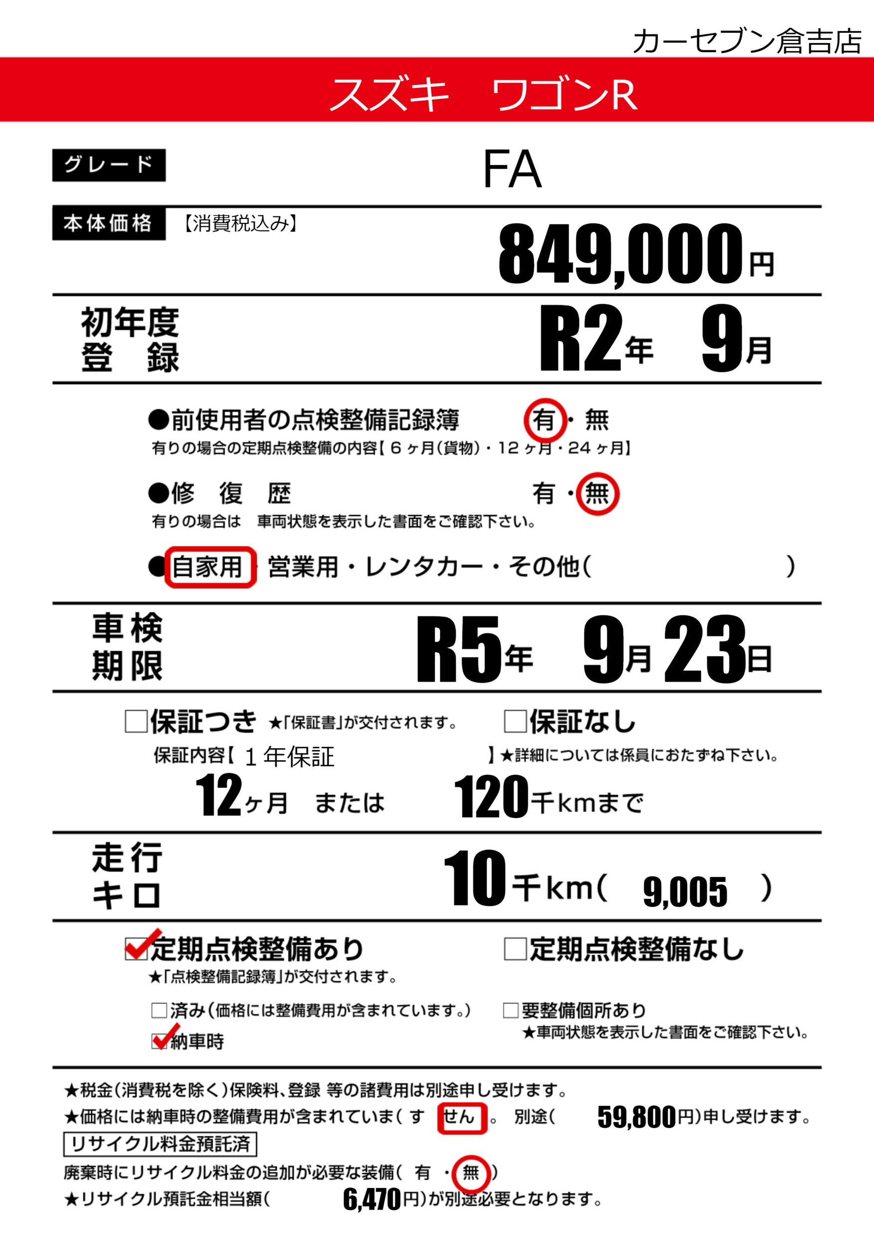| 車名 | スズキ ワゴンR | グレード ミッション 排気量 |