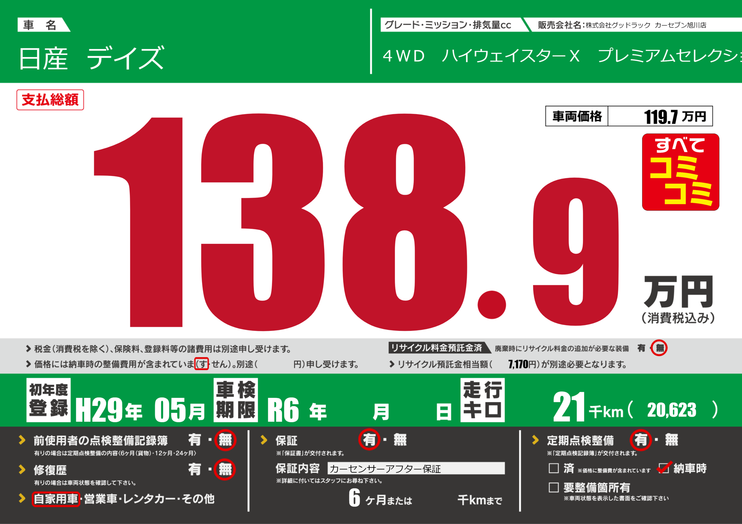 | 車名 | 日産 デイズ | グレード ミッション 排気量 |